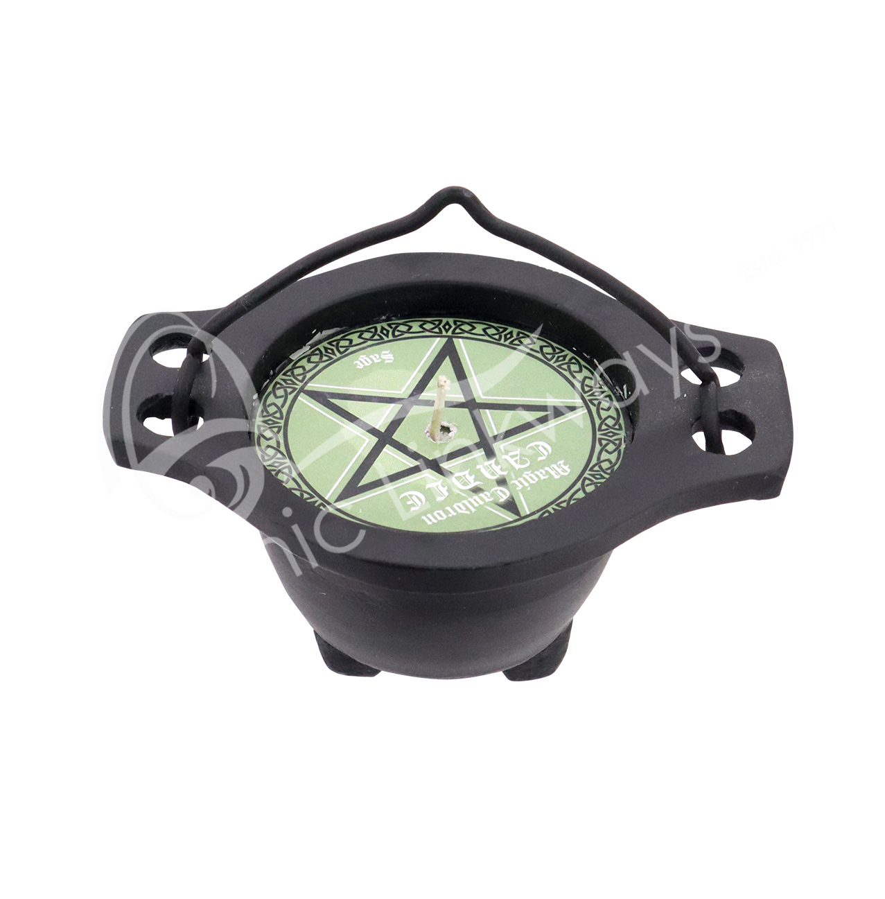 CANDLE – CAULDRON WITH SAGE MOSS GREEN WAX 4″L X 3″W
