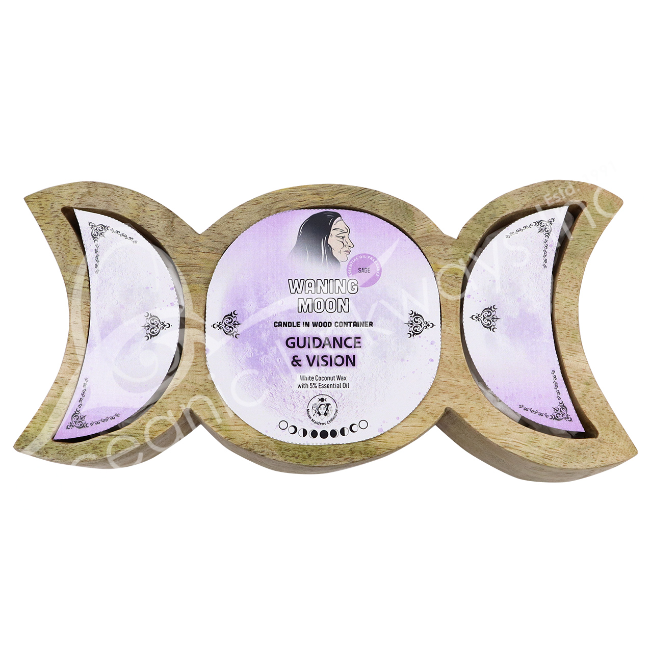 CANDLE – WOOD TRIPLE MOON THE CRONE SAGE/GUIDANCE & VISION 9″L X 4″W