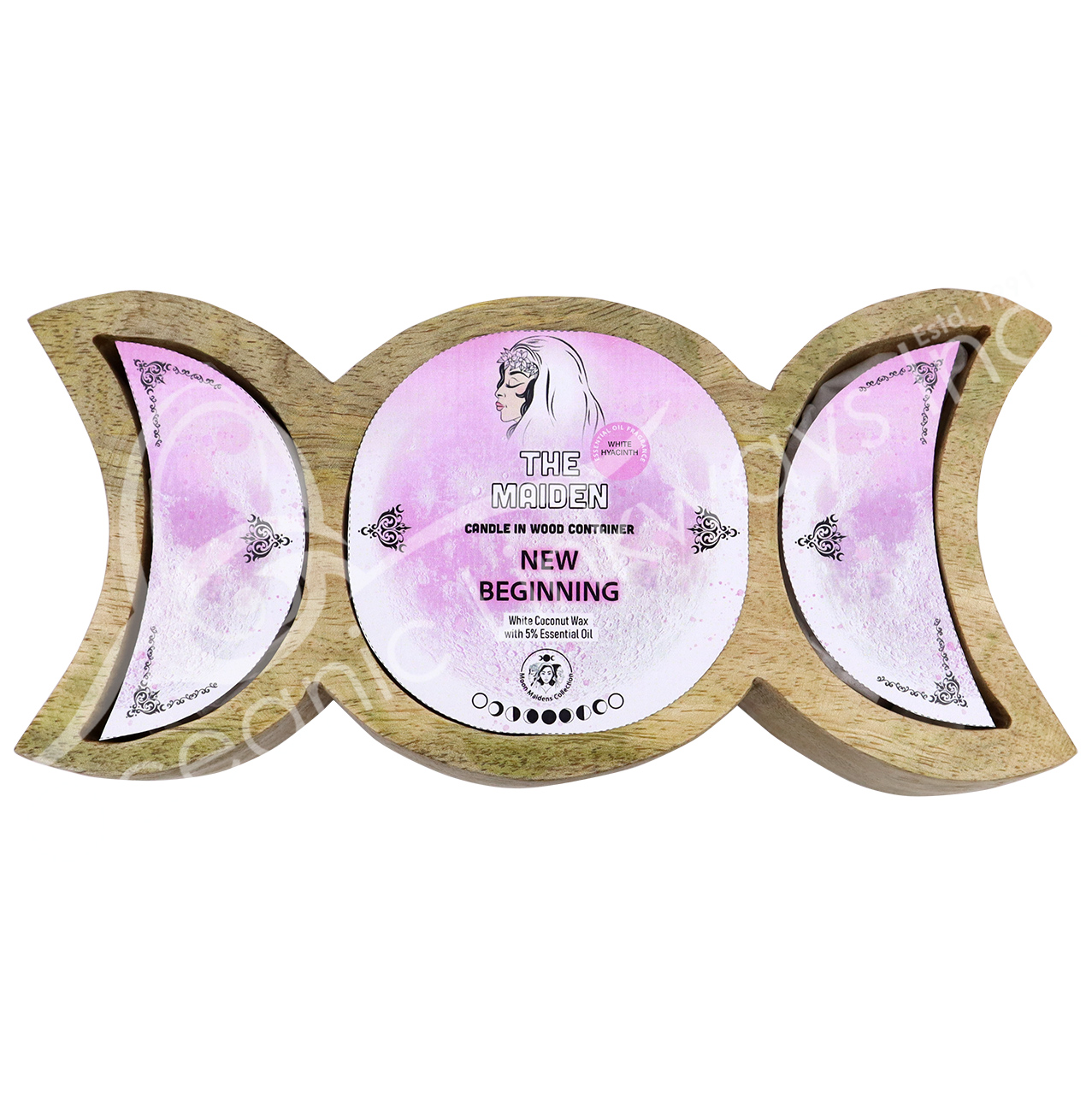 CANDLE – WOOD TRIPLE MOON THE MAIDEN WHITE HYACINTH/NEW BEGINNING 9″L X 4″W