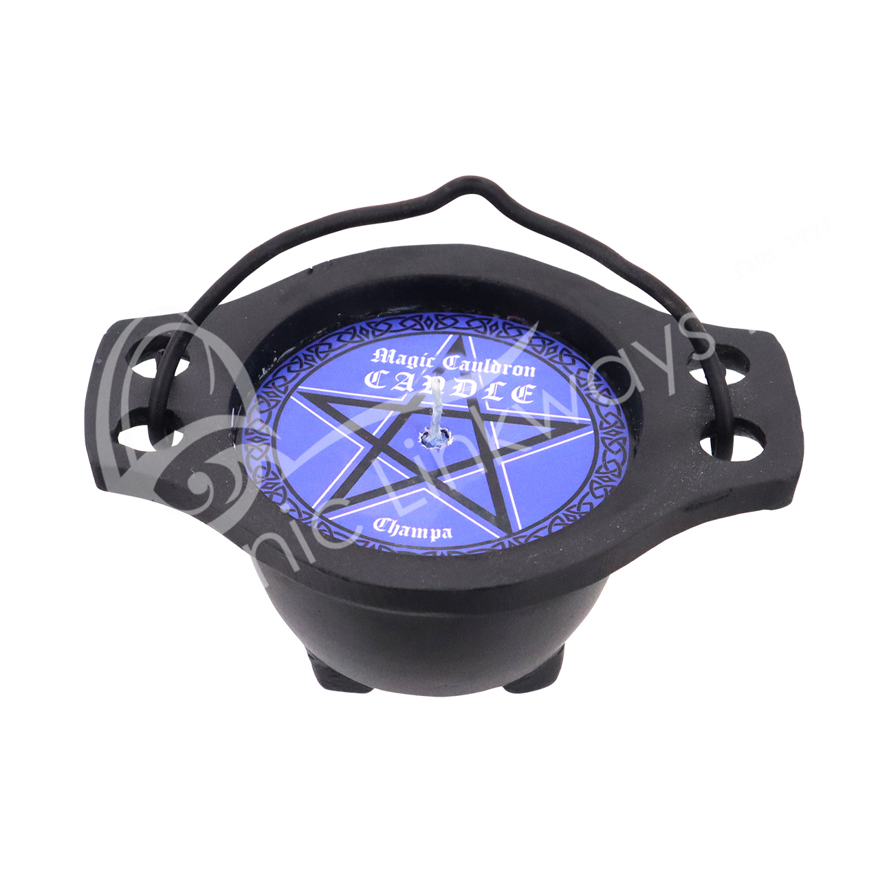 CANDLE – CAULDRON WITH NAG CHAMPA COBALT BLUE WAX 4″L X 2″H X 3″W