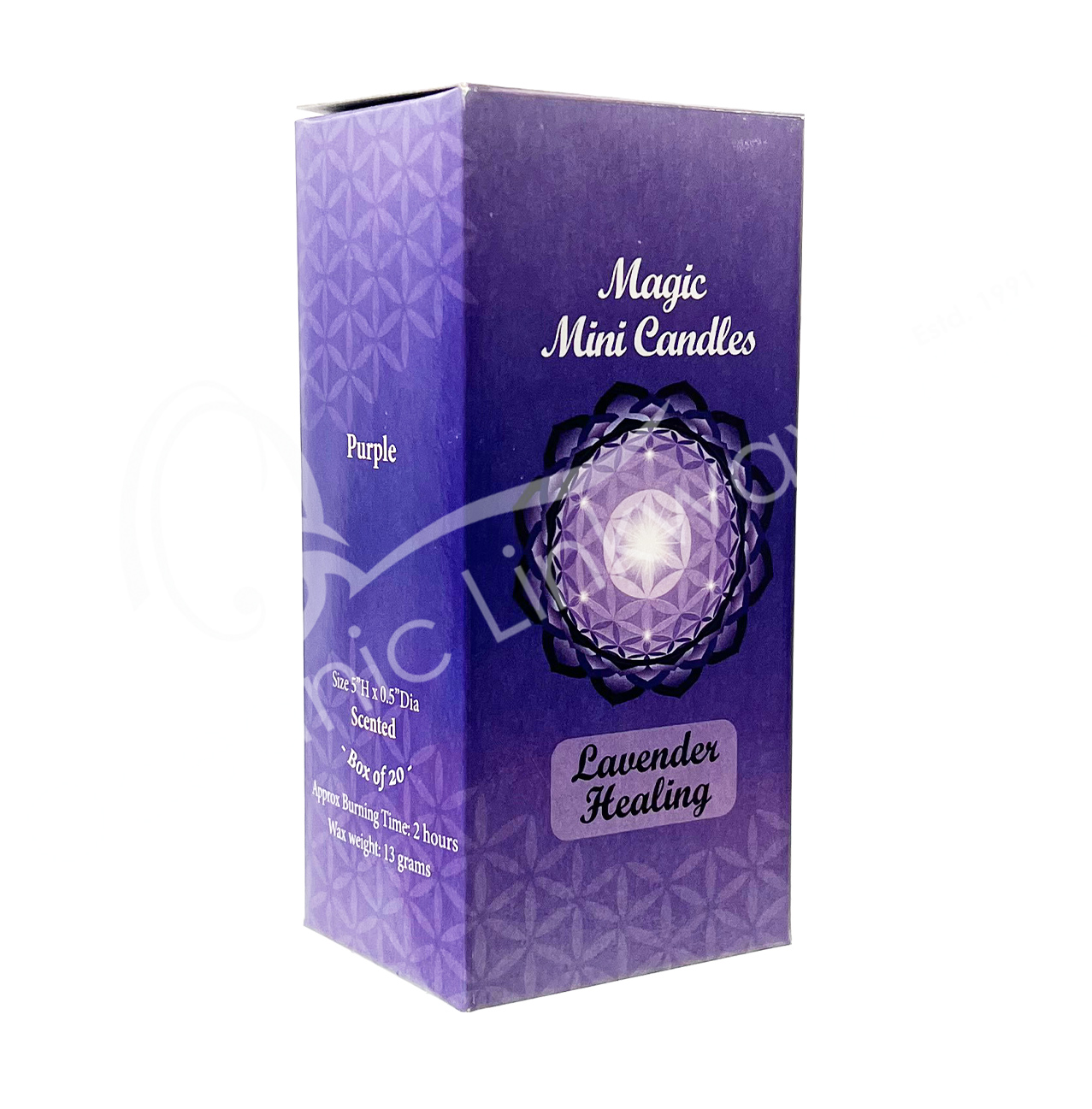 (CLOSE OUT) CANDLE – MINI SCENTED PURPLE LAVENDER/HEALING (PK 20) 4.75-5″H
