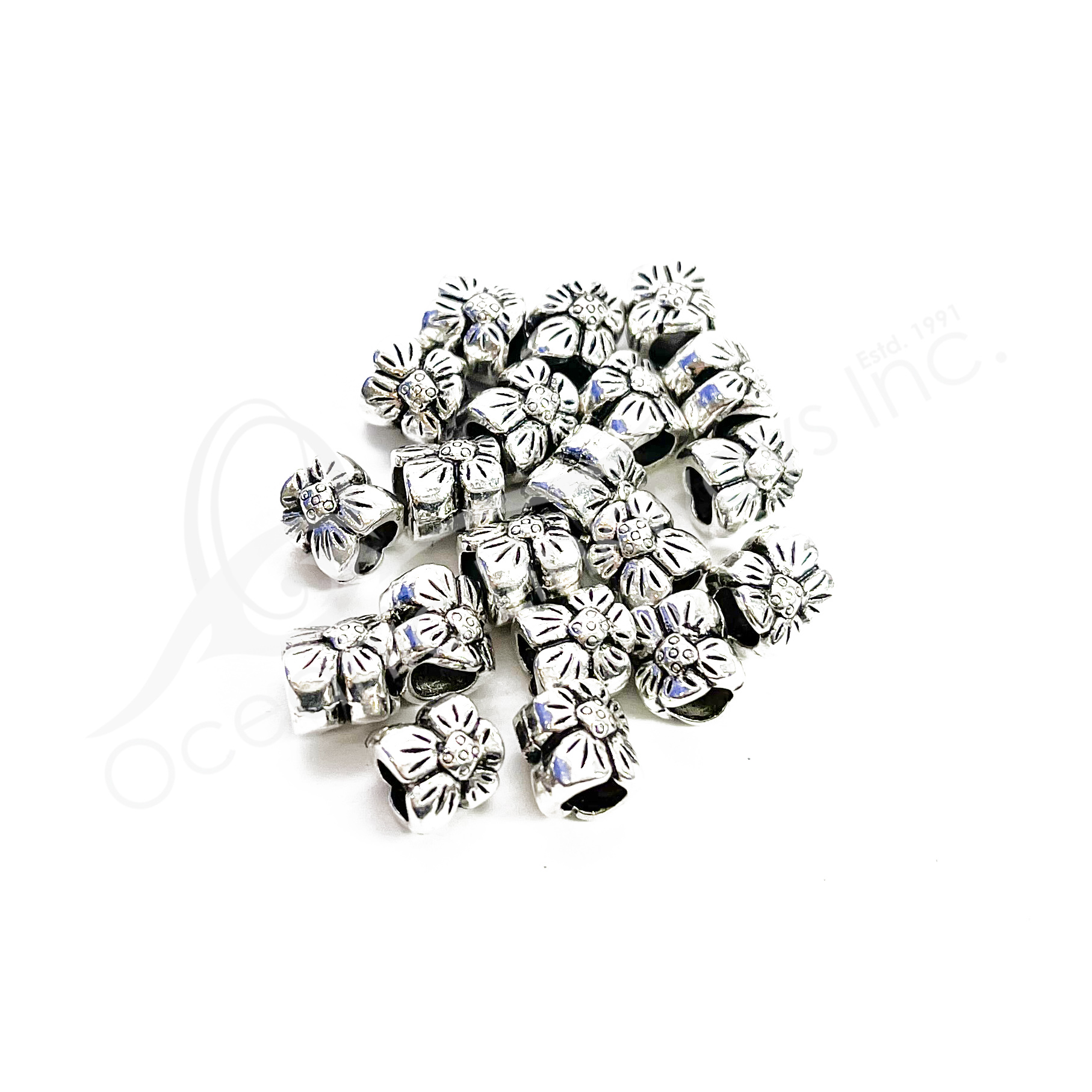 (CLOSE OUT) BEADS – METAL TUBE WITH FLOWERS OPENINGS (PK 20) 14 MM L X 13 MM DIA