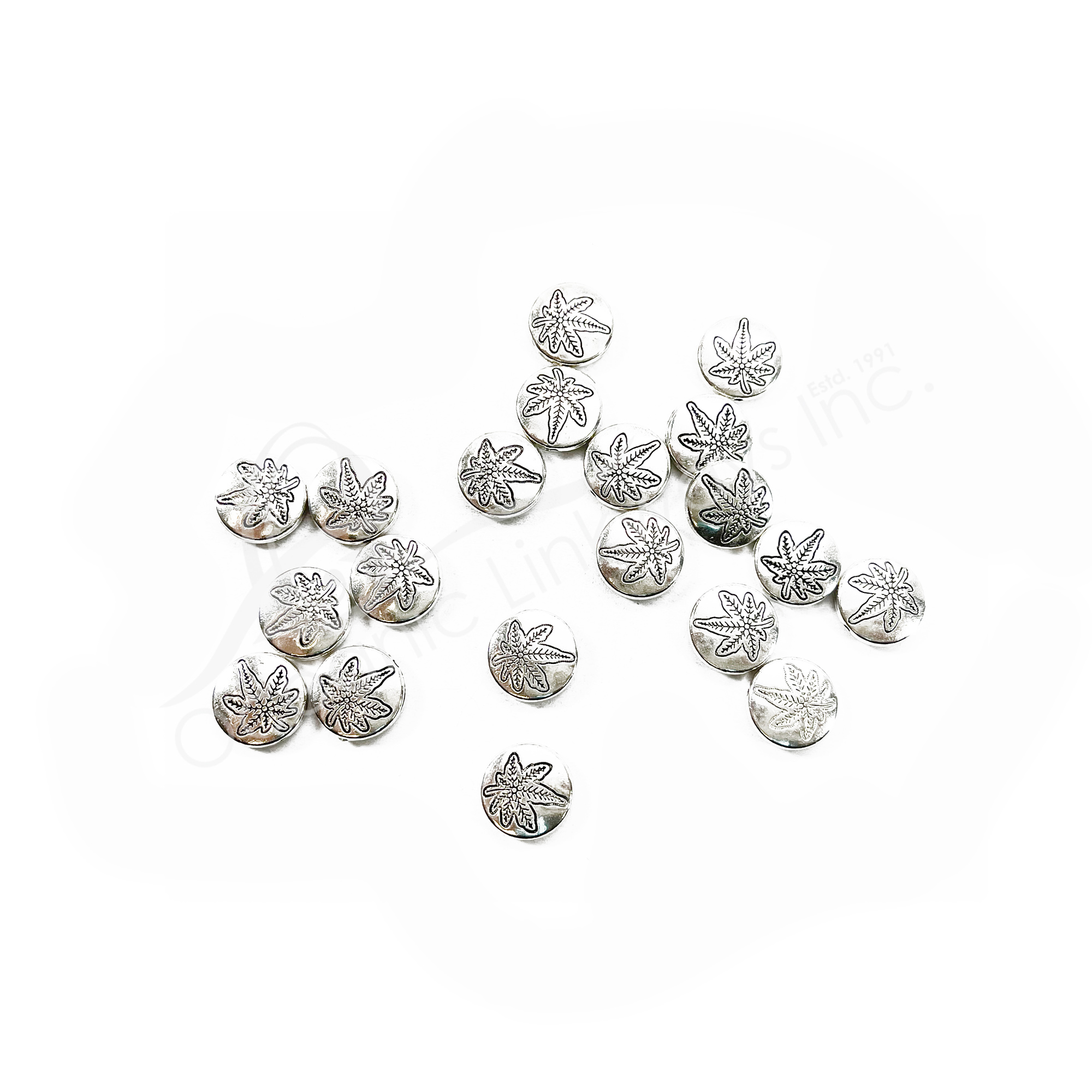 (CLOSE OUT) BEADS – METAL ROUND FLAT WITH POT LEAF (PK 100) 11 MM D X 3 MM T