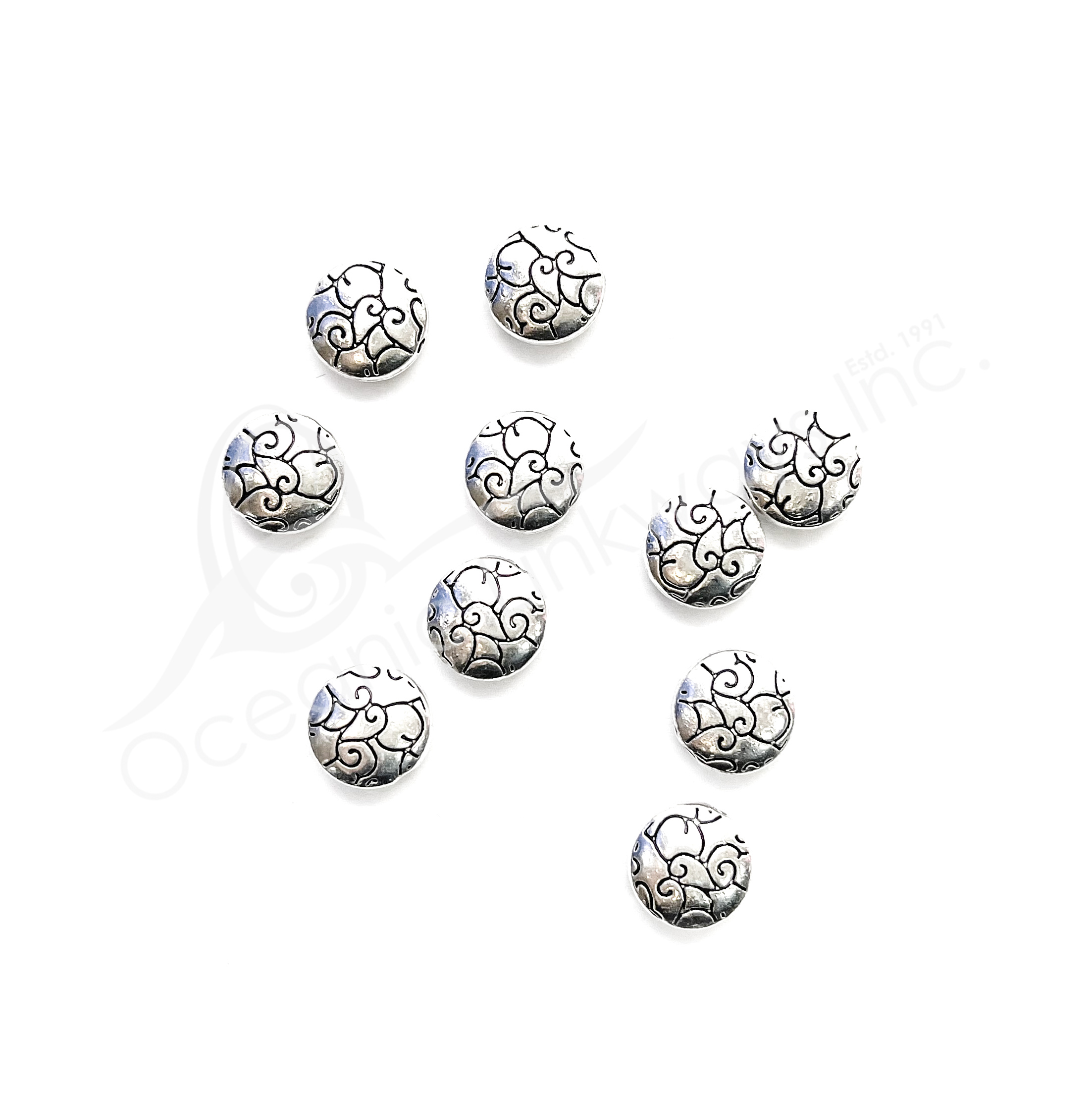 (CLOSE OUT) BEADS – METAL FLAT ROUND WITH SPIRAL DESIGN (PK 10) 1 CM D X 4 MM T