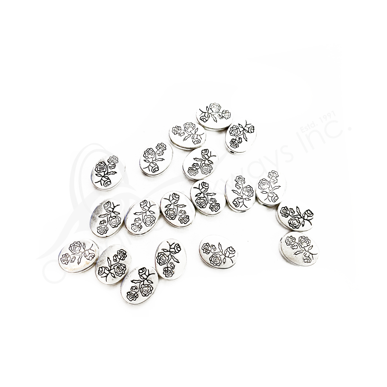 (CLOSE OUT) BEADS – METAL OVAL FLAT WITH ROSES (PK 100) 12 MM L X 3 MM T