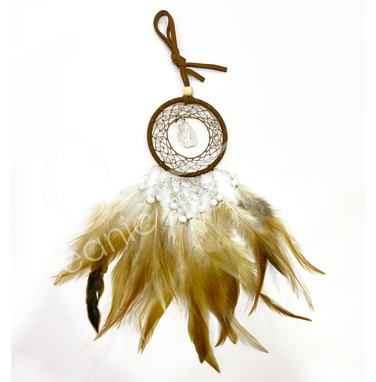 DREAMCATCHER – CRYSTAL QUARTZ WITH NATURAL FEATHERS 3.25″DIA. X 9.85″L