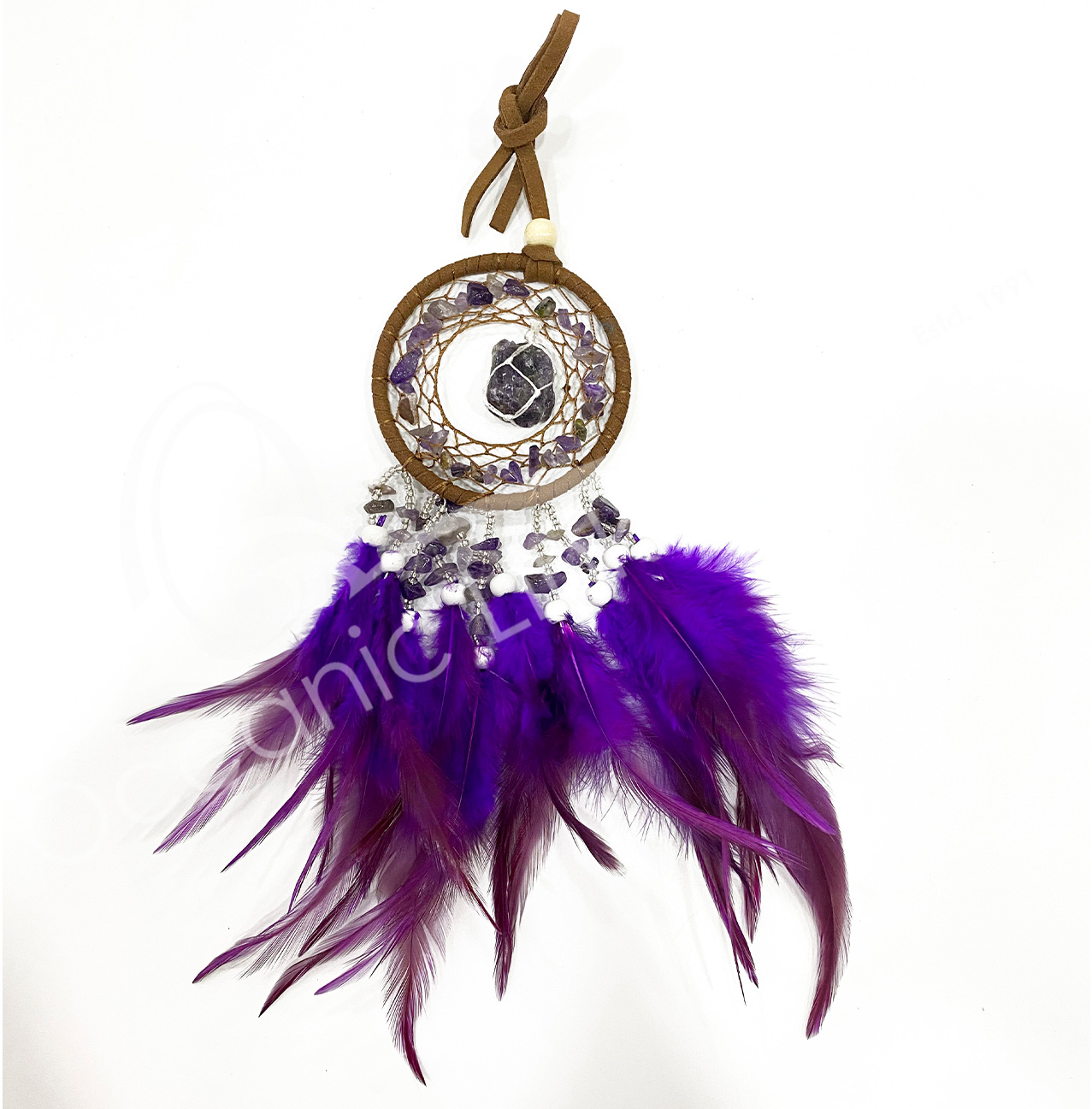 DREAMCATCHER – AMETHYST WITH PURPLE FEATHERS 3.25″DIA. X 9.85″L
