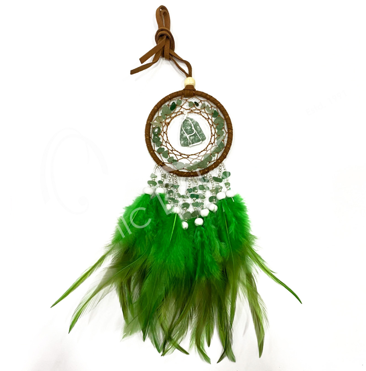 DREAMCATCHER – CHIPS & ROUGH GREEN AVENTURINE WITH DARK GREEN FEATHERS 3.25″DIA. X 9.85″L