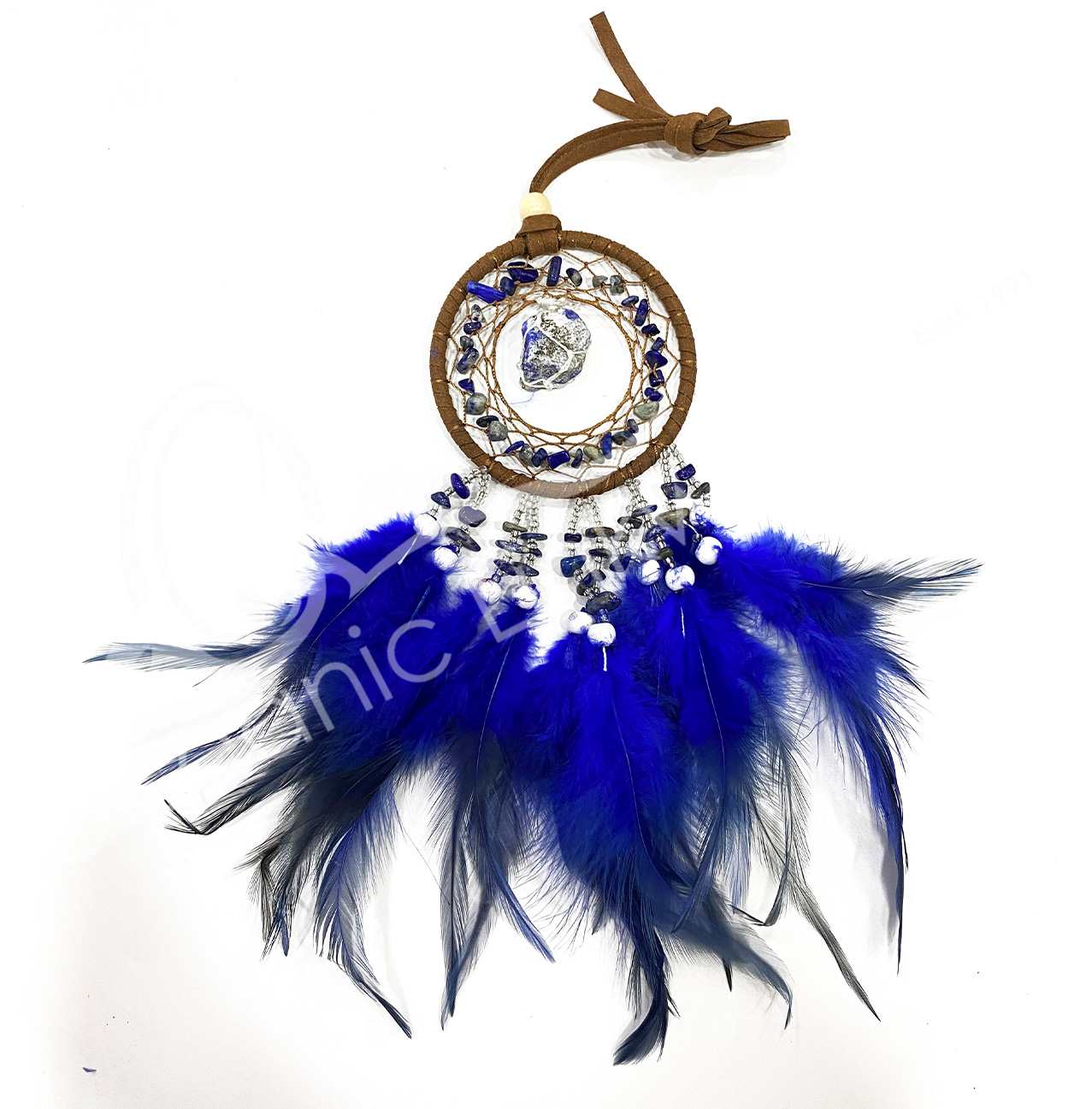 DREAMCATCHER – LAPIS LAZULI WITH DARK BLUE FEATHERS 3.25″DIA. X 9.85″L