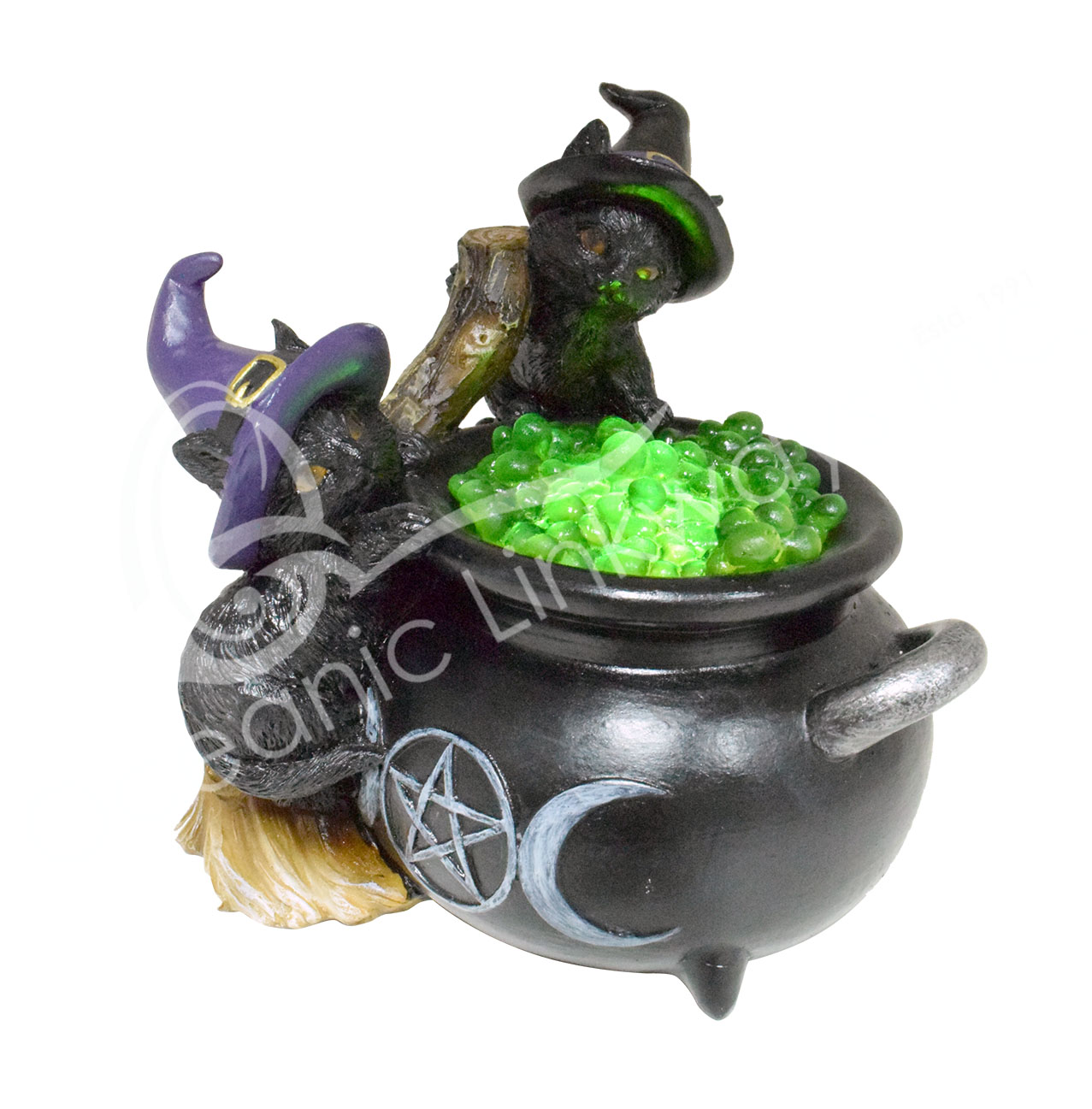STATUE – LED LIGHT BLACK CAT WITH CAULDRON & BROOM 5.10″L X 4.85″W X 5.30″H