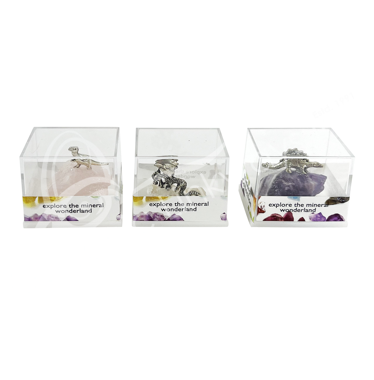 FIGURINE – DINOSAURS ON STONE IN ACRYLIC BOX POP-UP DISPLAY (SET OF 60) 8.25 X 8″