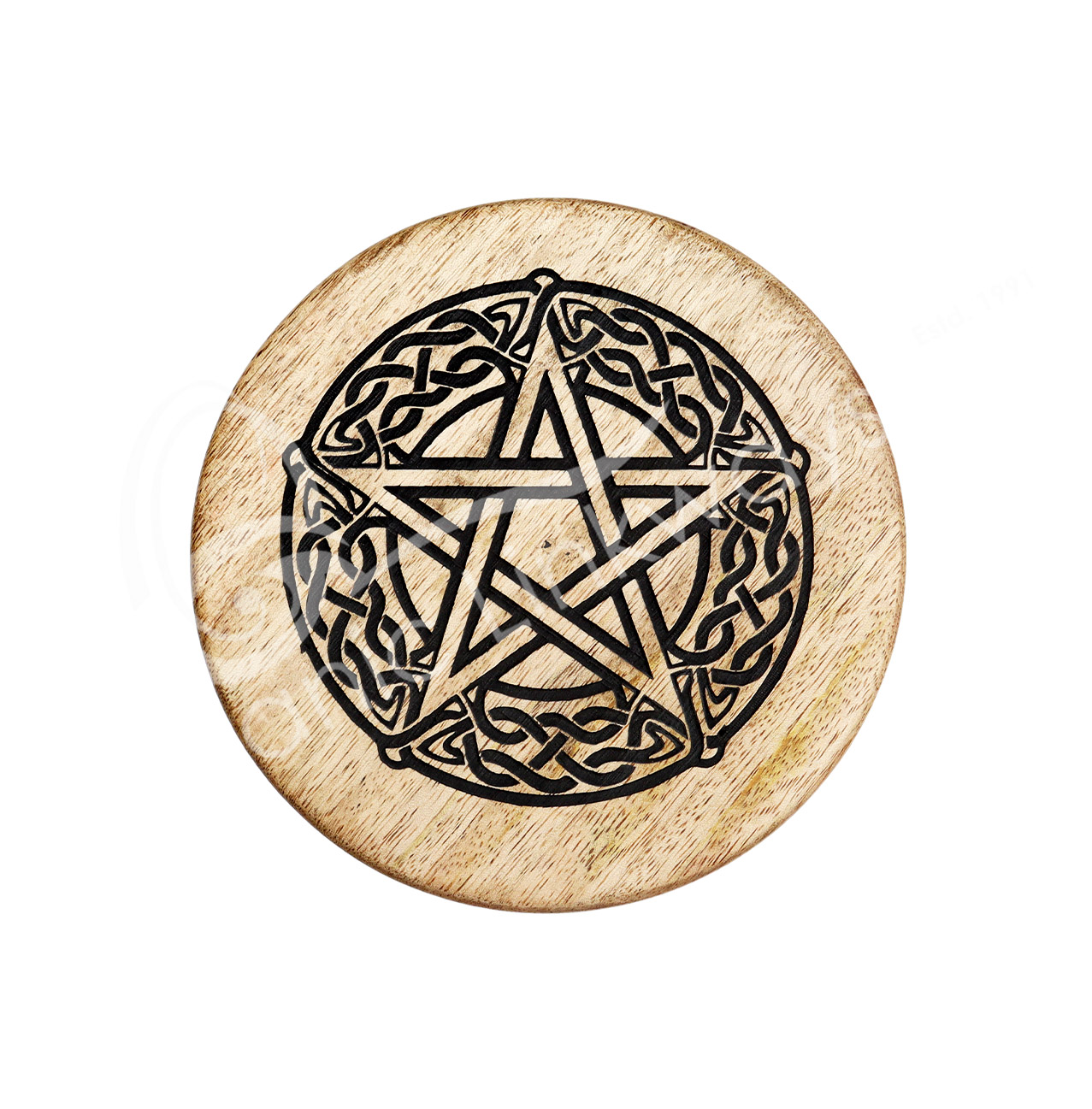 ALTAR TABLE – MANGO WOOD ENGRAVED PENTACLE 6″DIA. X 4″H