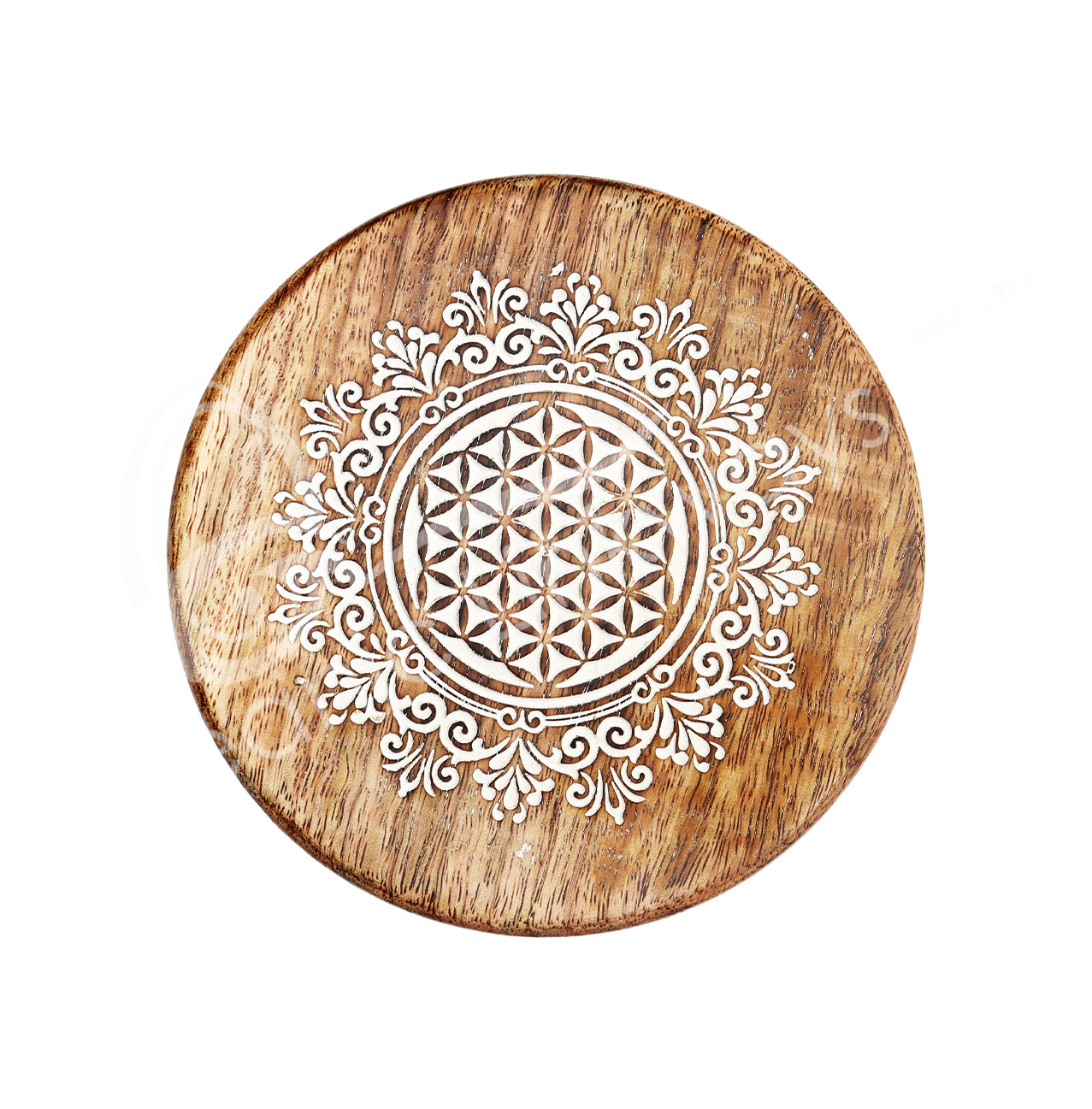ALTAR TABLE – MANGO WOOD ENGRAVED FLOWER OF LIFE 6″DIA. X 4″H