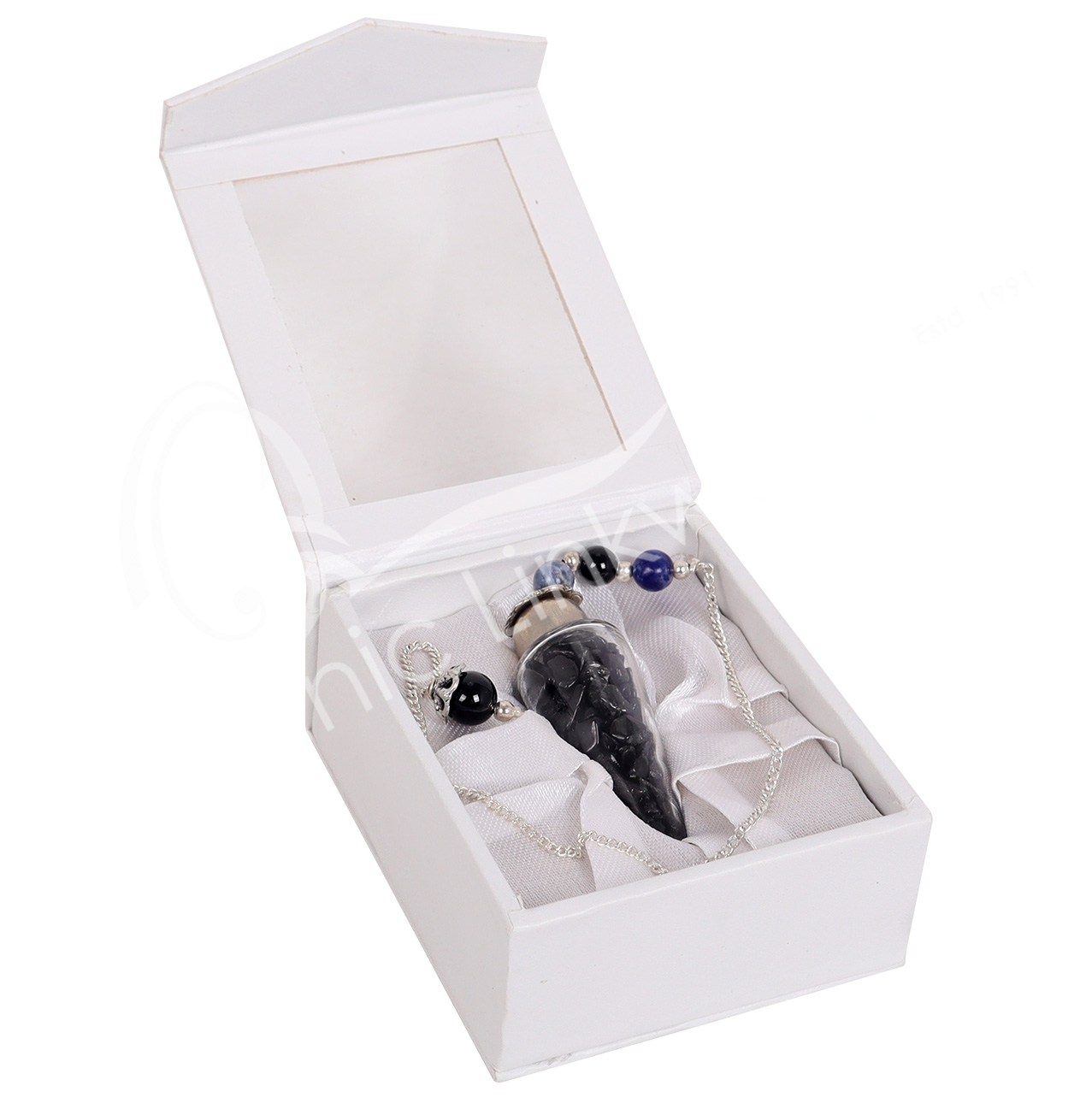 PENDULUM – GLASS BALL PROTECTION FLUORITE & BLACK TOURMALINE CHIPS STONES PLAIN CHAIN 9″L