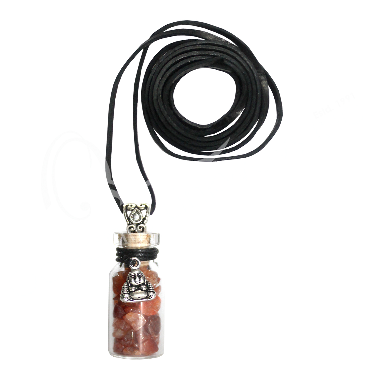 NECKLACE – CHIPS STONES IN BOTTLE CARNELIAN WITH HAPPY BUDDHA 1.5″H