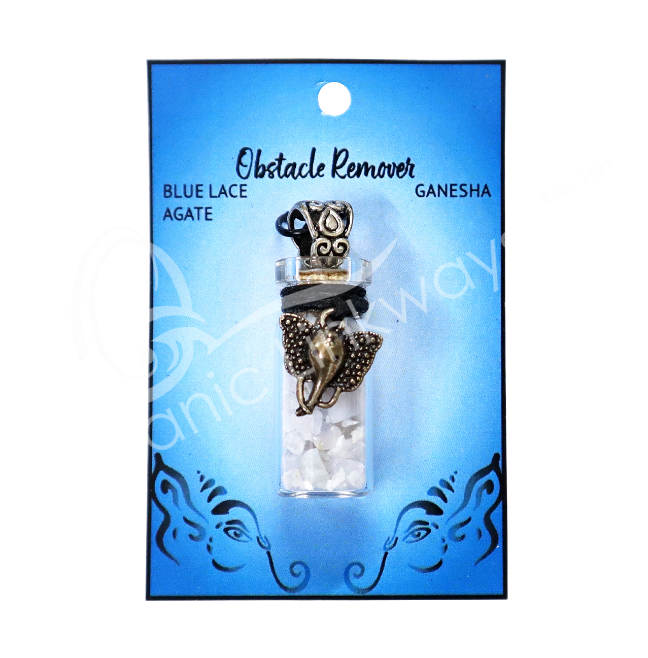 NECKLACE – CHIPS STONES IN BOTTLE AGATE, BLUE LACE WITH GANESHA 1.5″H