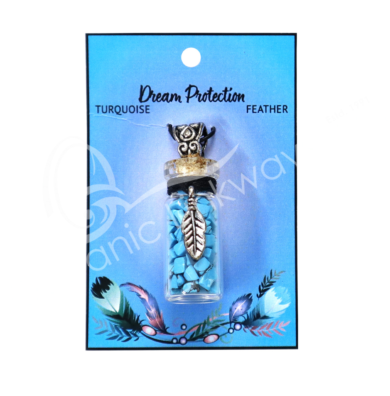NECKLACE – CHIPS STONES IN BOTTLE TURQUOISE WITH FEATHER 1.5″H