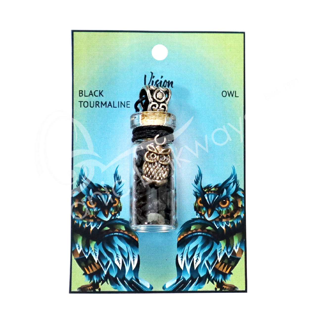NECKLACE – CHIPS STONES IN BOTTLE TOURMALINE, BLACK WITH OWL 1.5″H