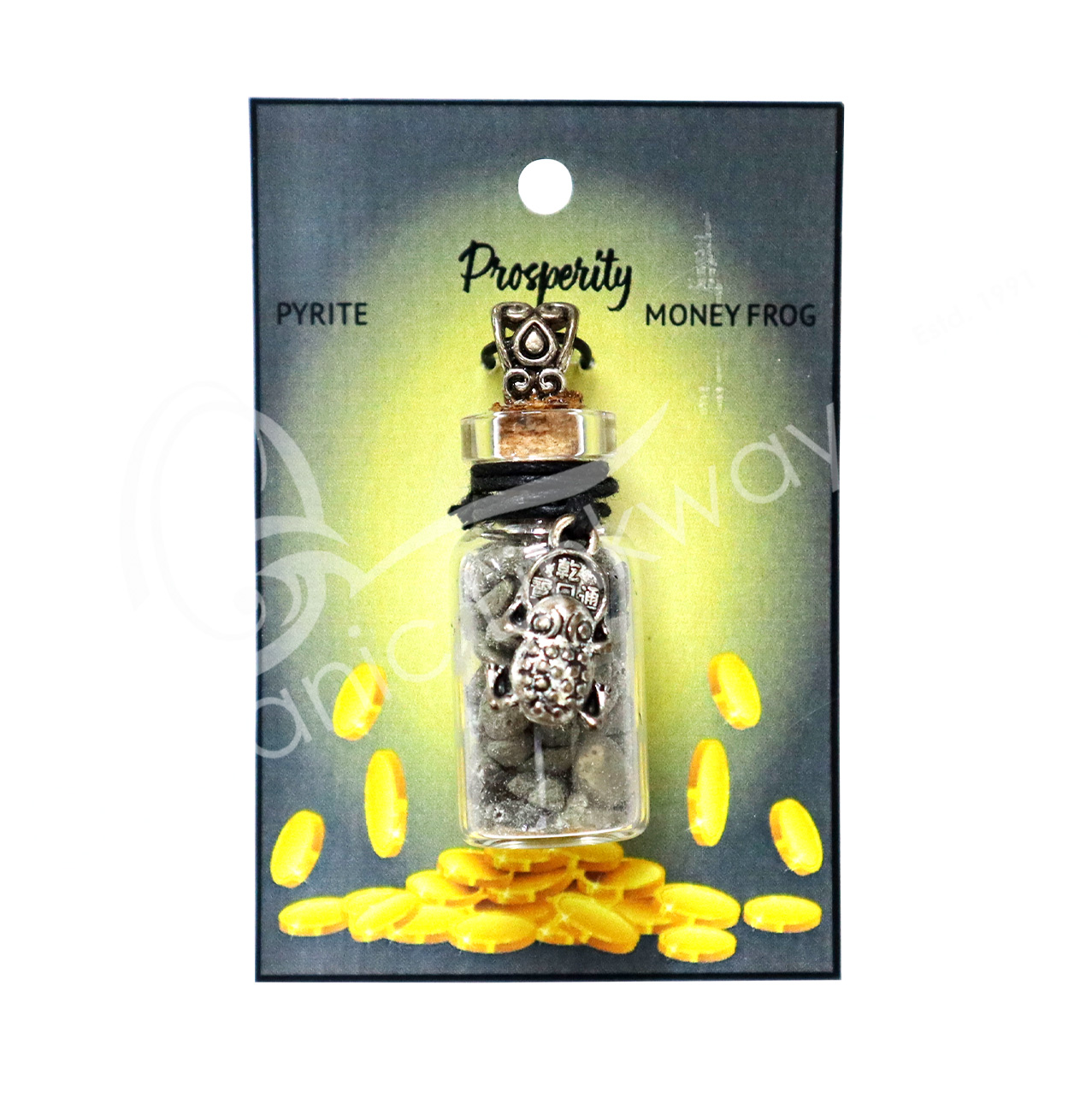 NECKLACE – CHIPS STONES IN BOTTLE PERIDOT WITH MONEY BAG 1.5″H