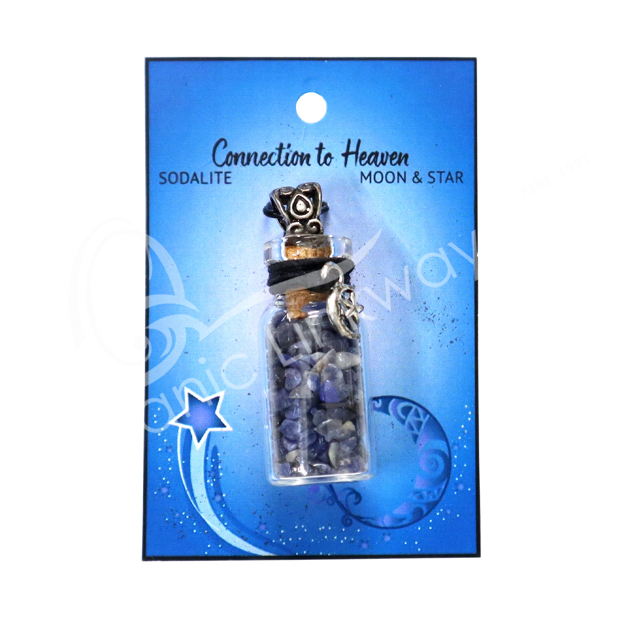 NECKLACE – CHIPS STONES IN BOTTLE SODALITE WITH MOON & STAR 1.5″H
