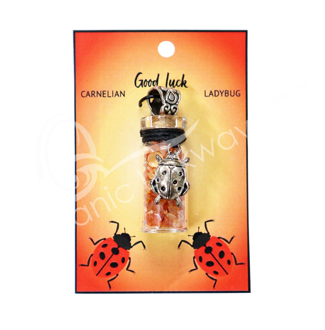 NECKLACE – CHIPS STONES IN BOTTLE CARNELIAN WITH LADYBUG 1.5″H