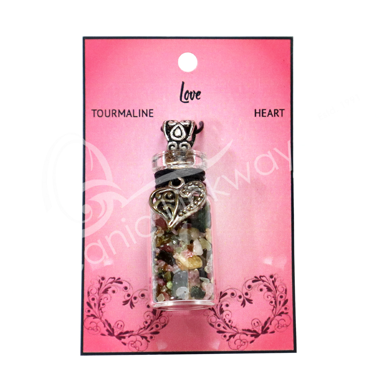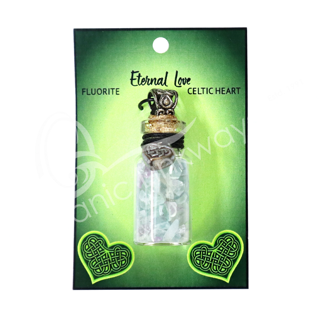NECKLACE – CHIPS STONES IN BOTTLE FLUORITE WITH CELTIC HEART 1.5″H