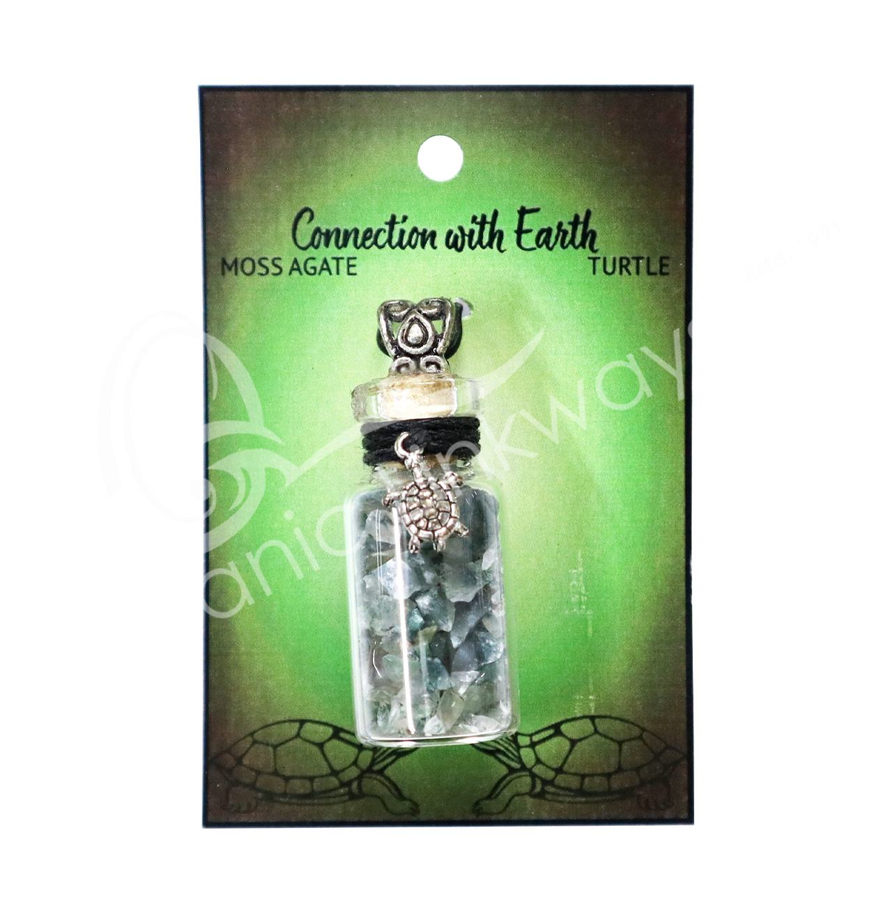NECKLACE – CHIPS STONES IN BOTTLE AGATE, GREEN MOSS WITH TURTLE 1.5″H