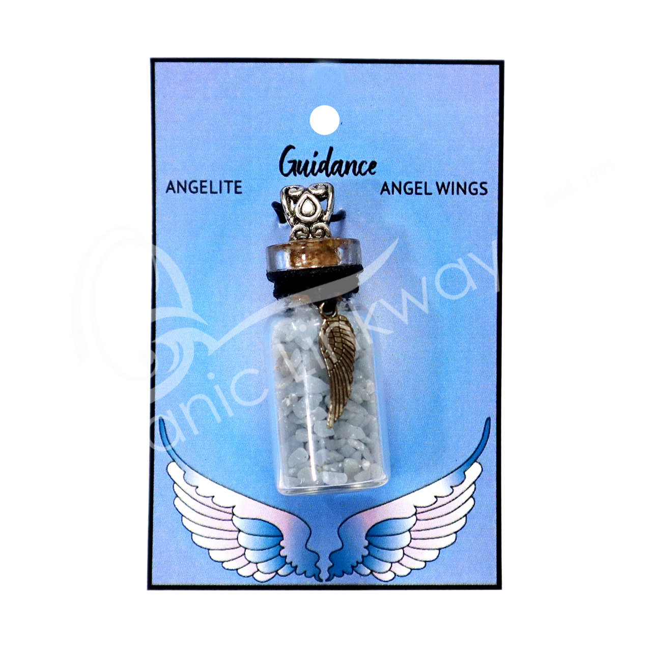 NECKLACE – CHIPS STONES IN BOTTLE ANGELITE WITH ANGEL WING 1.5″H
