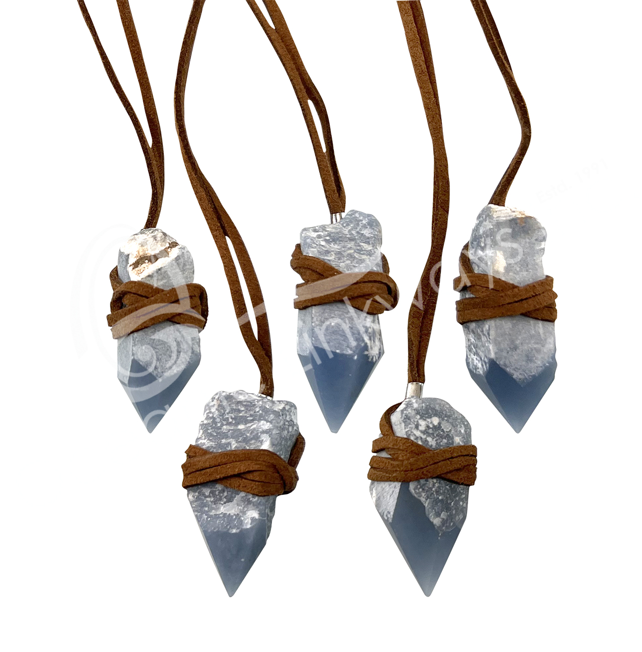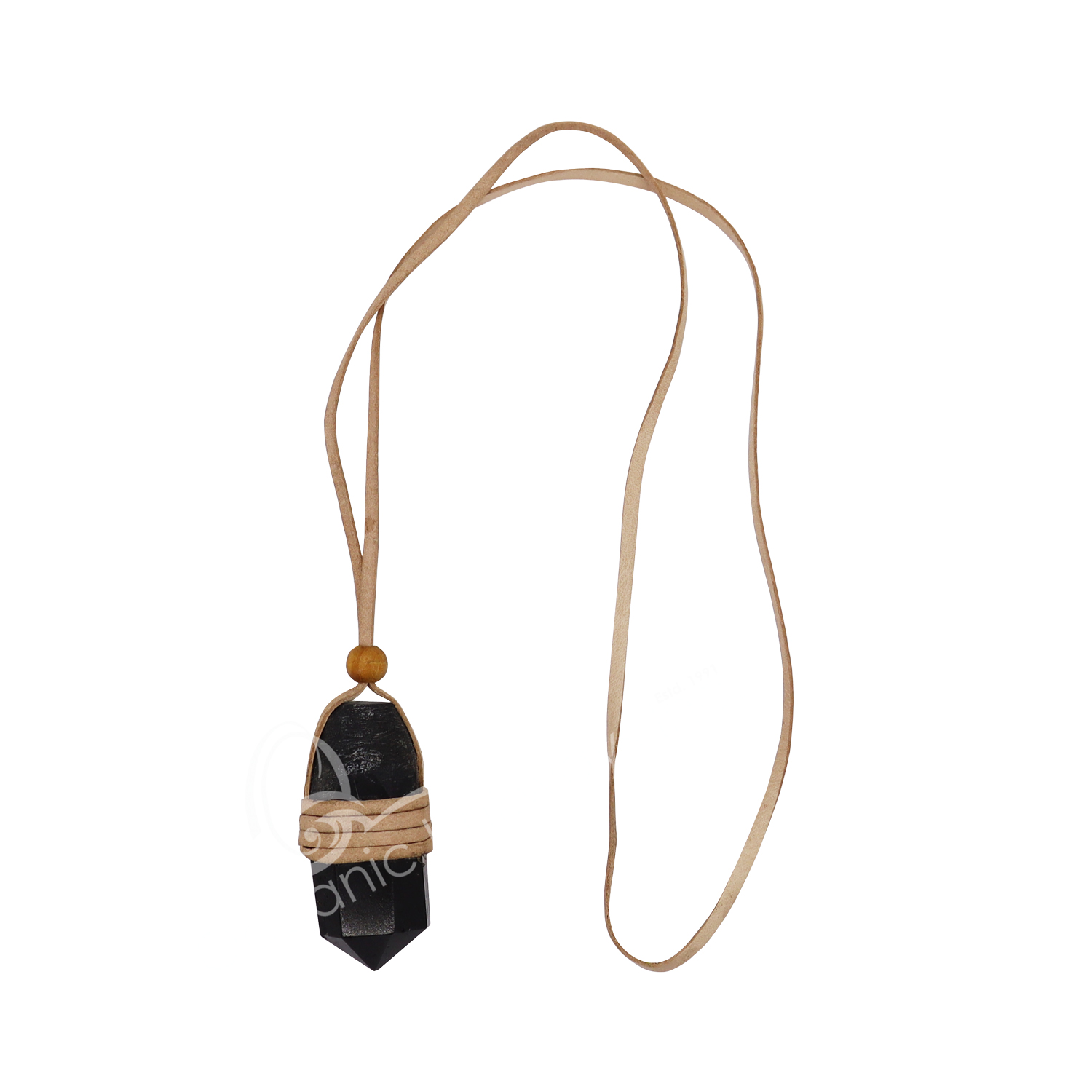NECKLACE – POINT CRYSTAL QUARTZ WRAPPED WITH LEATHER CORD (PK 3) 28″L