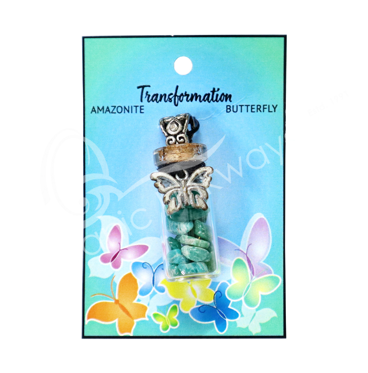 NECKLACE – CHIPS STONES IN BOTTLE AMAZONITE WITH BUTTERFLY 1.5″H