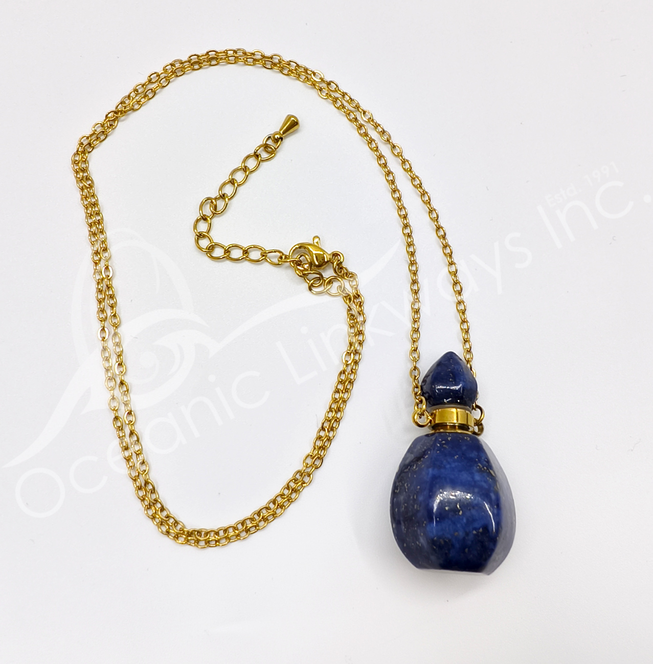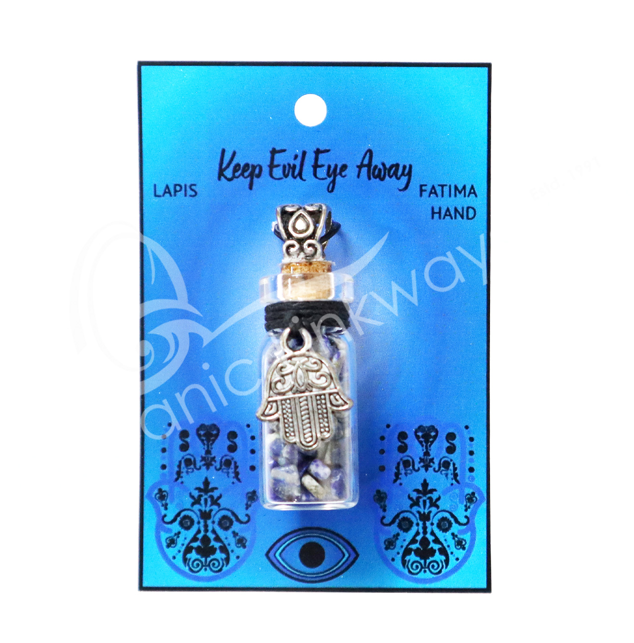 NECKLACE – CHIPS STONES IN BOTTLE LAPIS LAZULI WITH HAND OF FATIMA 1.5″H