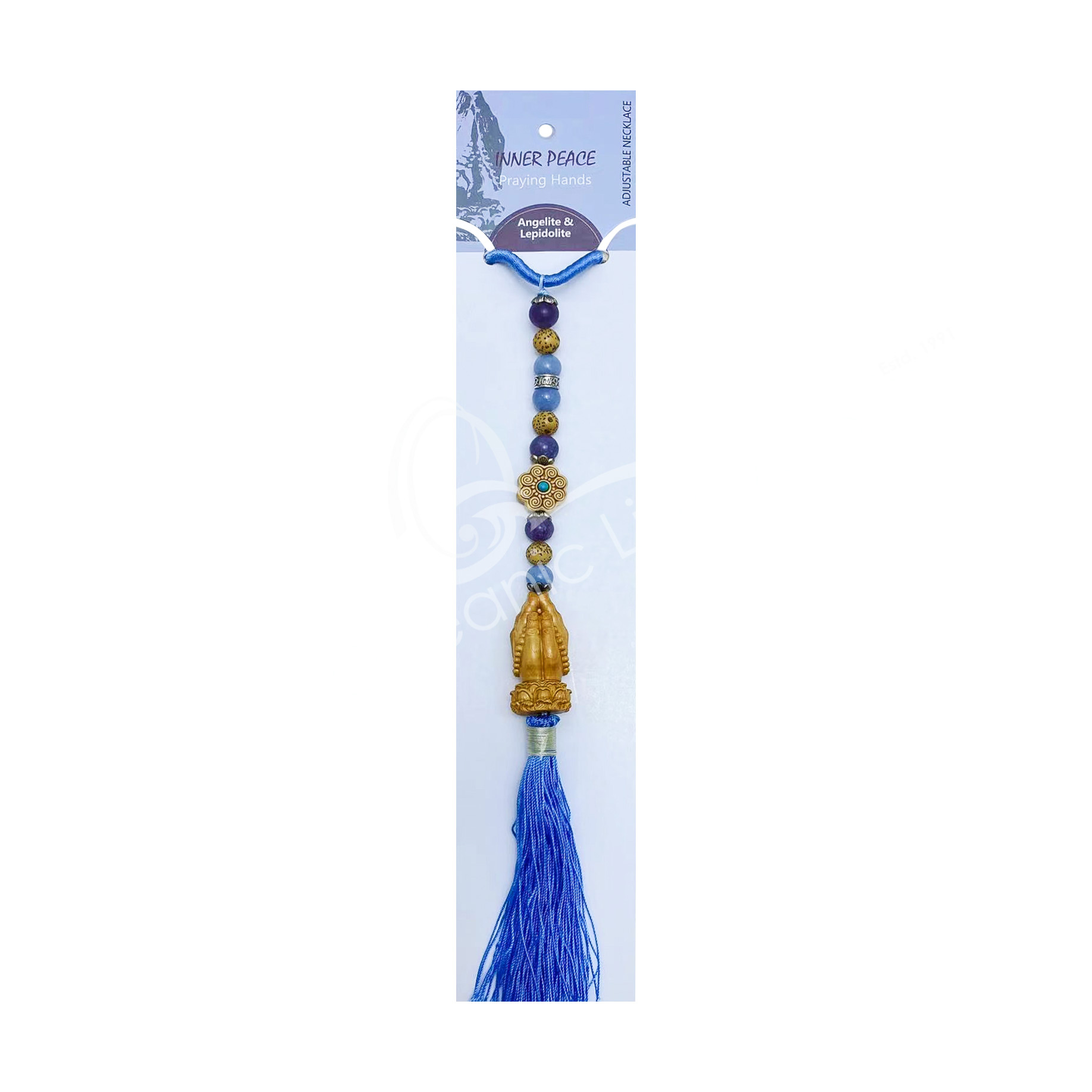 (CLOSE OUT) NECKLACE/HANGING – PRAYING HANDS/INNER PEACE WITH ANGELITE & LEPIDOLITE 19.5-22.5″L
