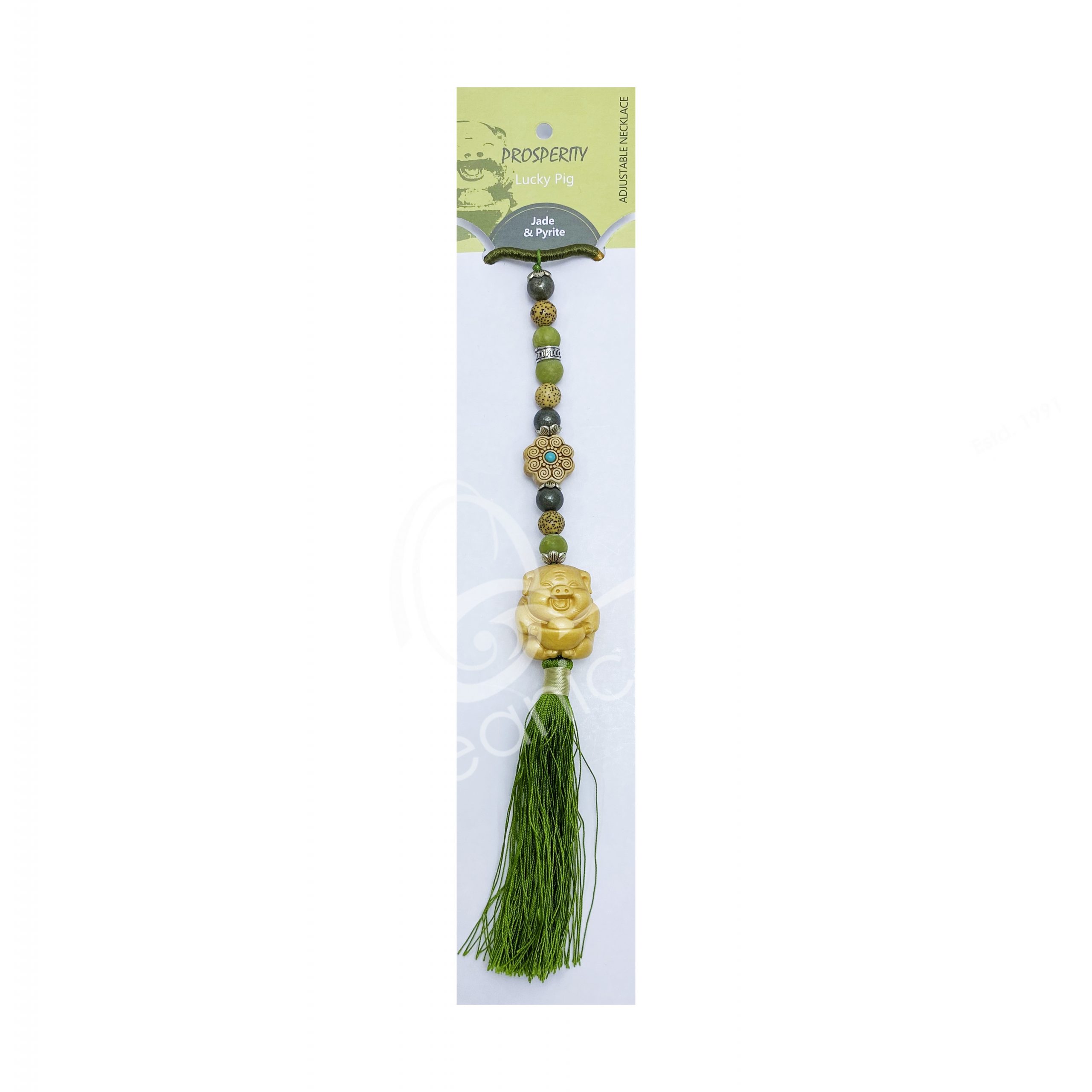 (CLOSE OUT) NECKLACE/HANGING – LUCKY PIG/PROSPERITY WITH JADE & PYRITE 18.5-21.5″L