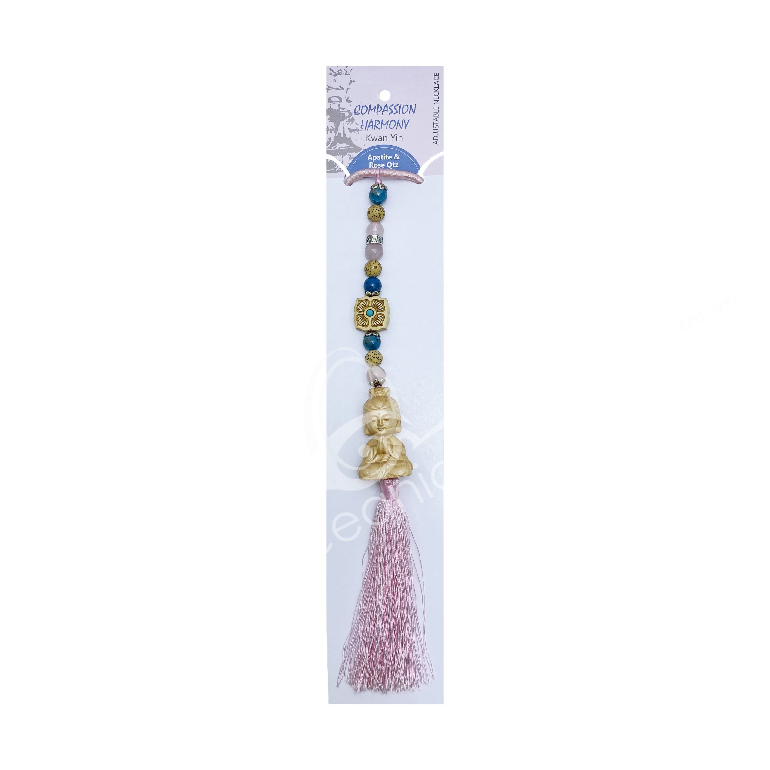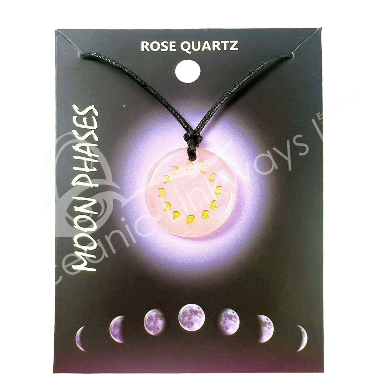 NECKLACE – MOON PHASES ROSE QUARTZ ROUND ENGRAVED 9-16.5″L