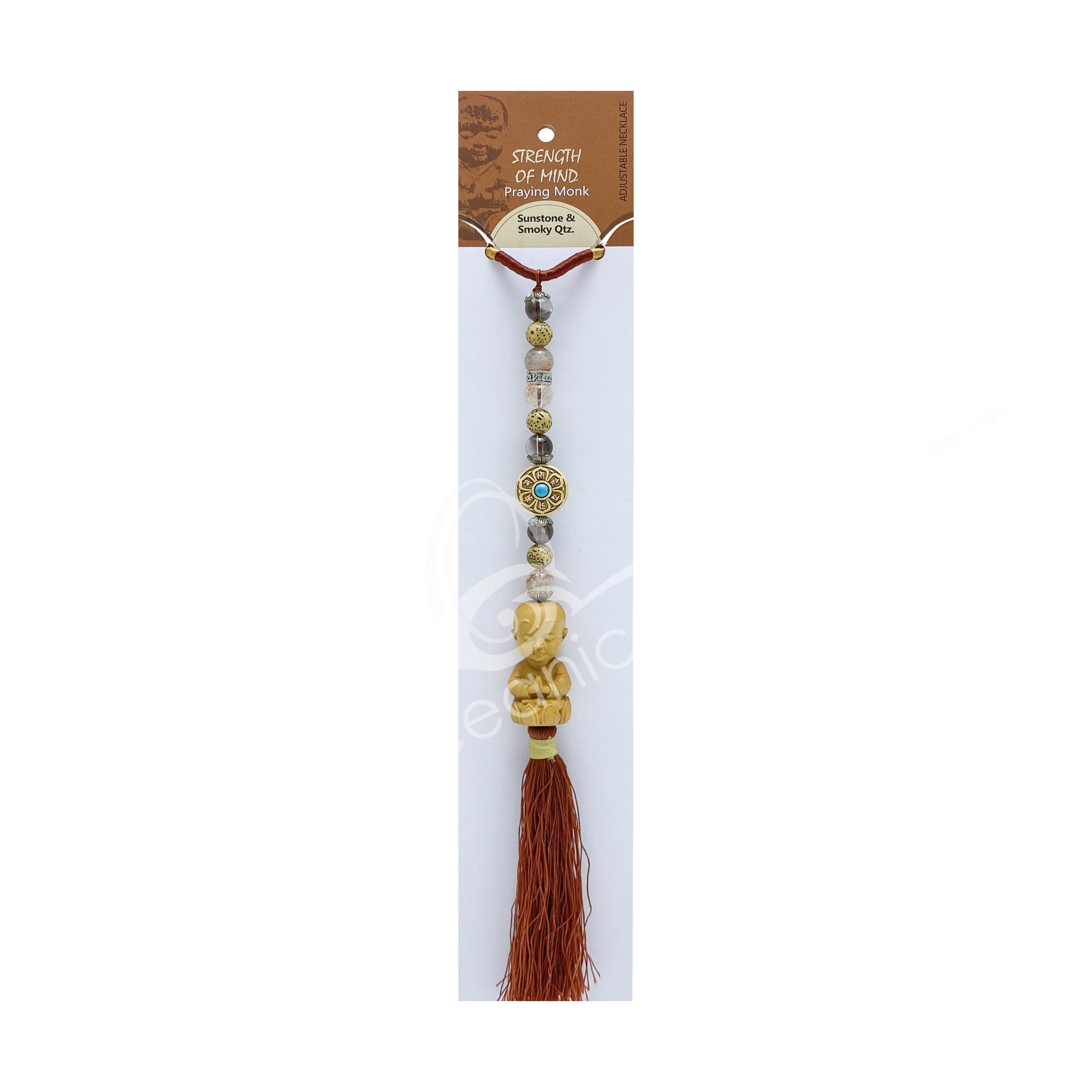 (CLOSE OUT) NECKLACE/HANGING – PRAYING MONK/STRENGTH OF MIND WITH SUNSTONE & SMOKY QUARTZ 18.25-21.25″L