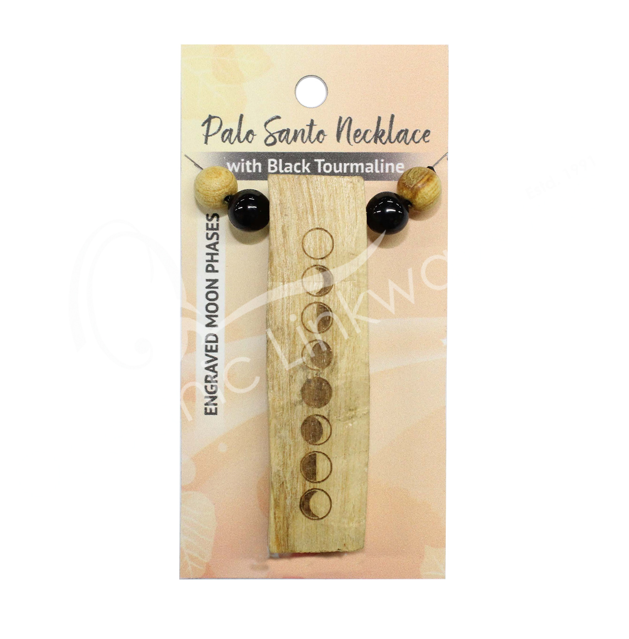 NECKLACE – PALO SANTO WOOD MOON PHASES ENGRAVED WITH BLACK TOURMALINE (PK 3) 6-12″L