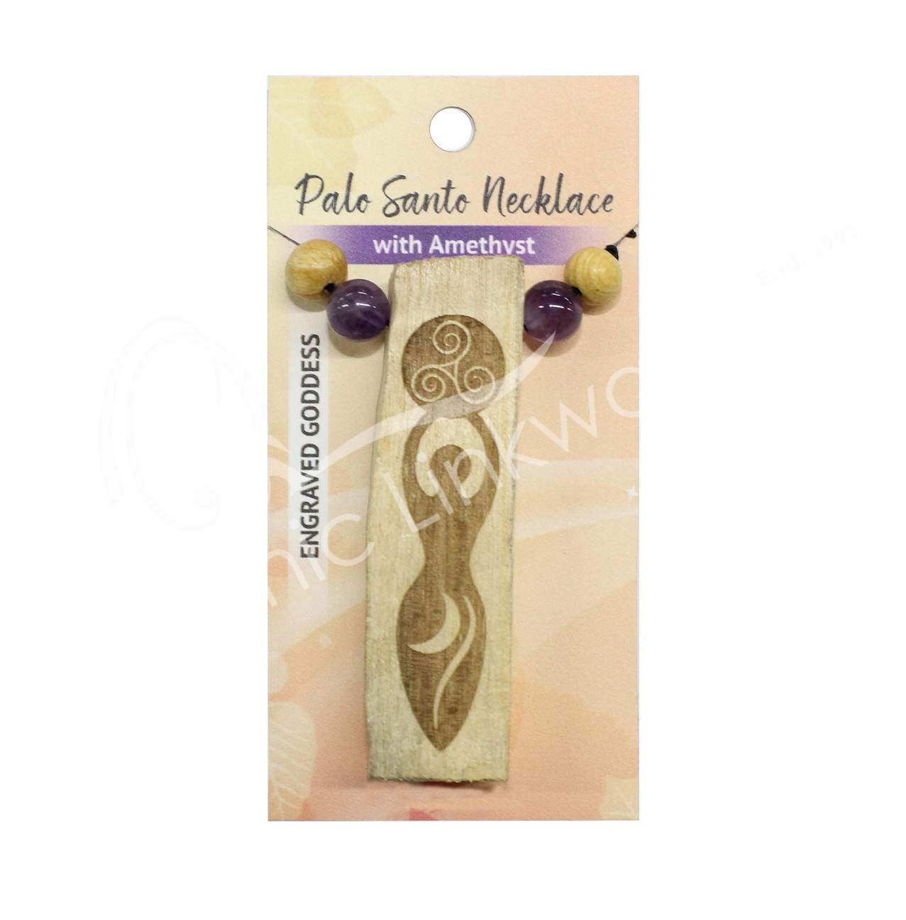 NECKLACE – PALO SANTO WOOD GODDESS ENGRAVED WITH AMETHYST (PK 3) 6-12″L