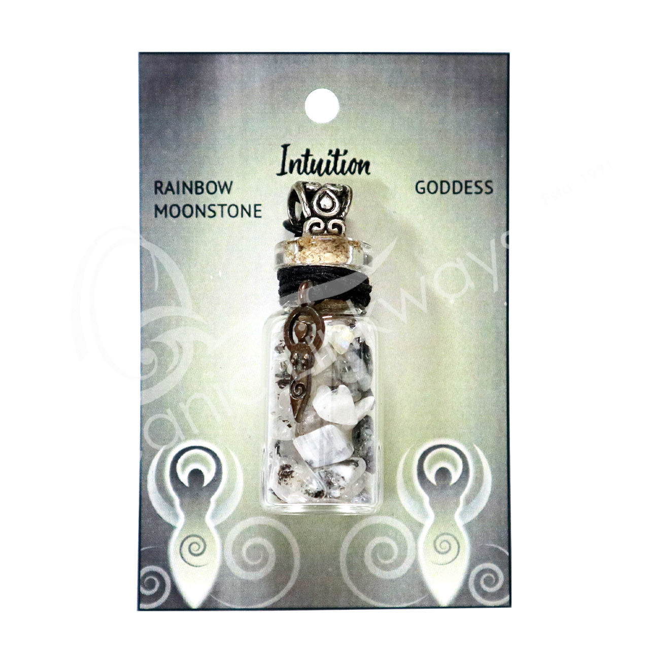 NECKLACE – CHIPS STONES IN BOTTLE MOONSTONE, RAINBOW WITH GODDESS 1.5″H