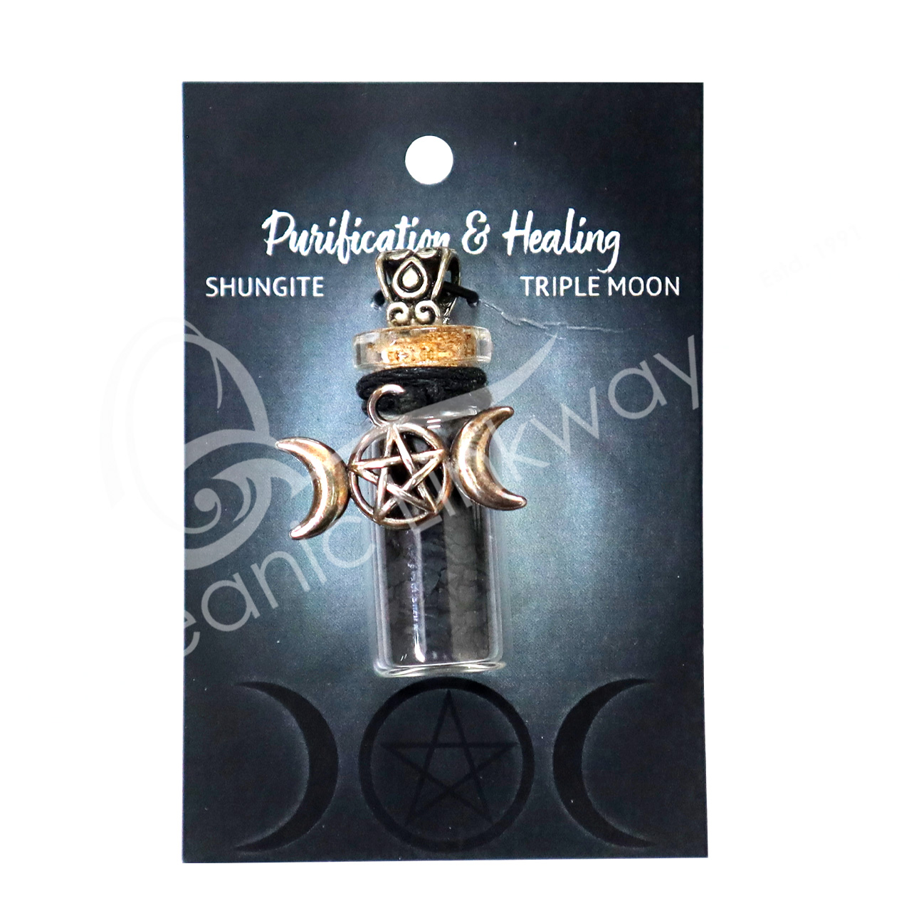 NECKLACE – CHIPS STONES IN BOTTLE SHUNGITE WITH TRIPLE MOON 1.5″H