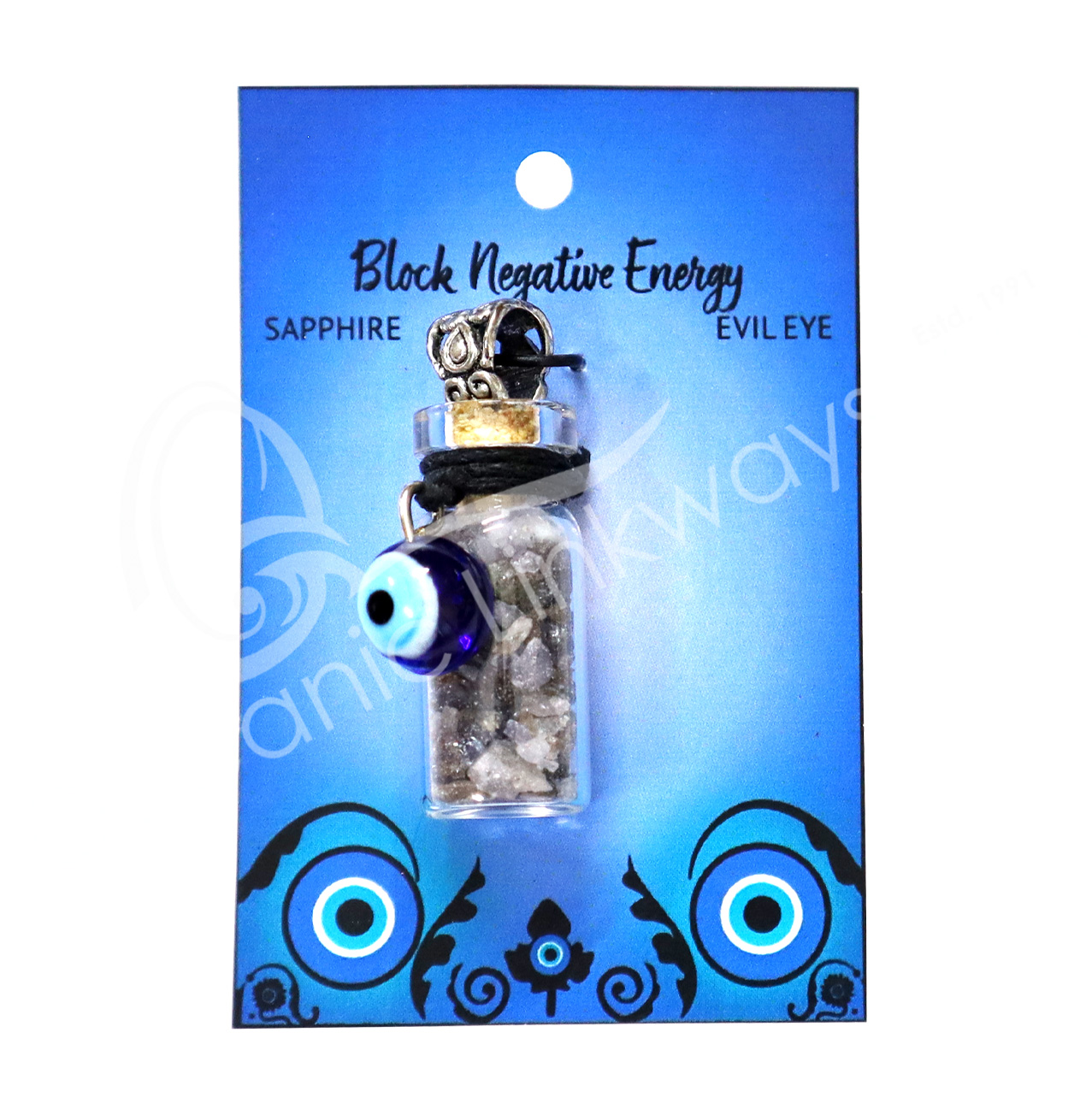 NECKLACE – CHIPS STONES IN BOTTLE SAPPHIRE WITH EVIL EYE 1.5″H