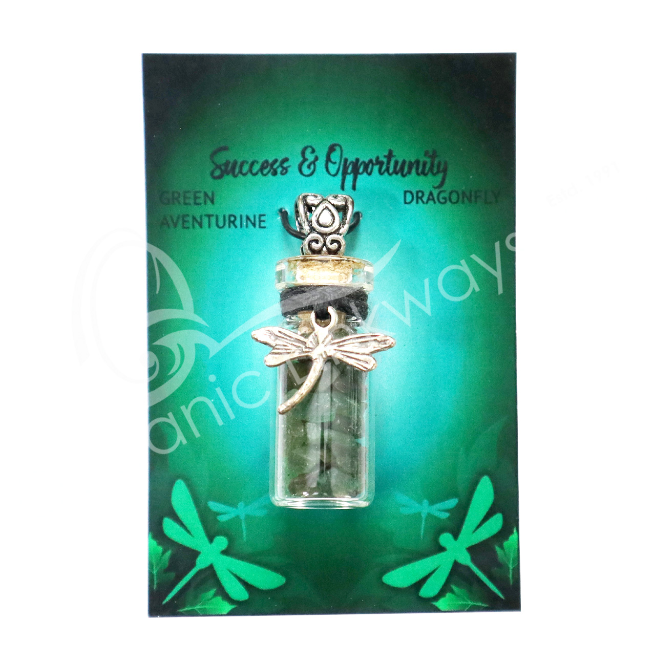 NECKLACE – CHIPS STONES IN BOTTLE AVENTURINE, GREEN WITH DRAGONFLY 1.5″H