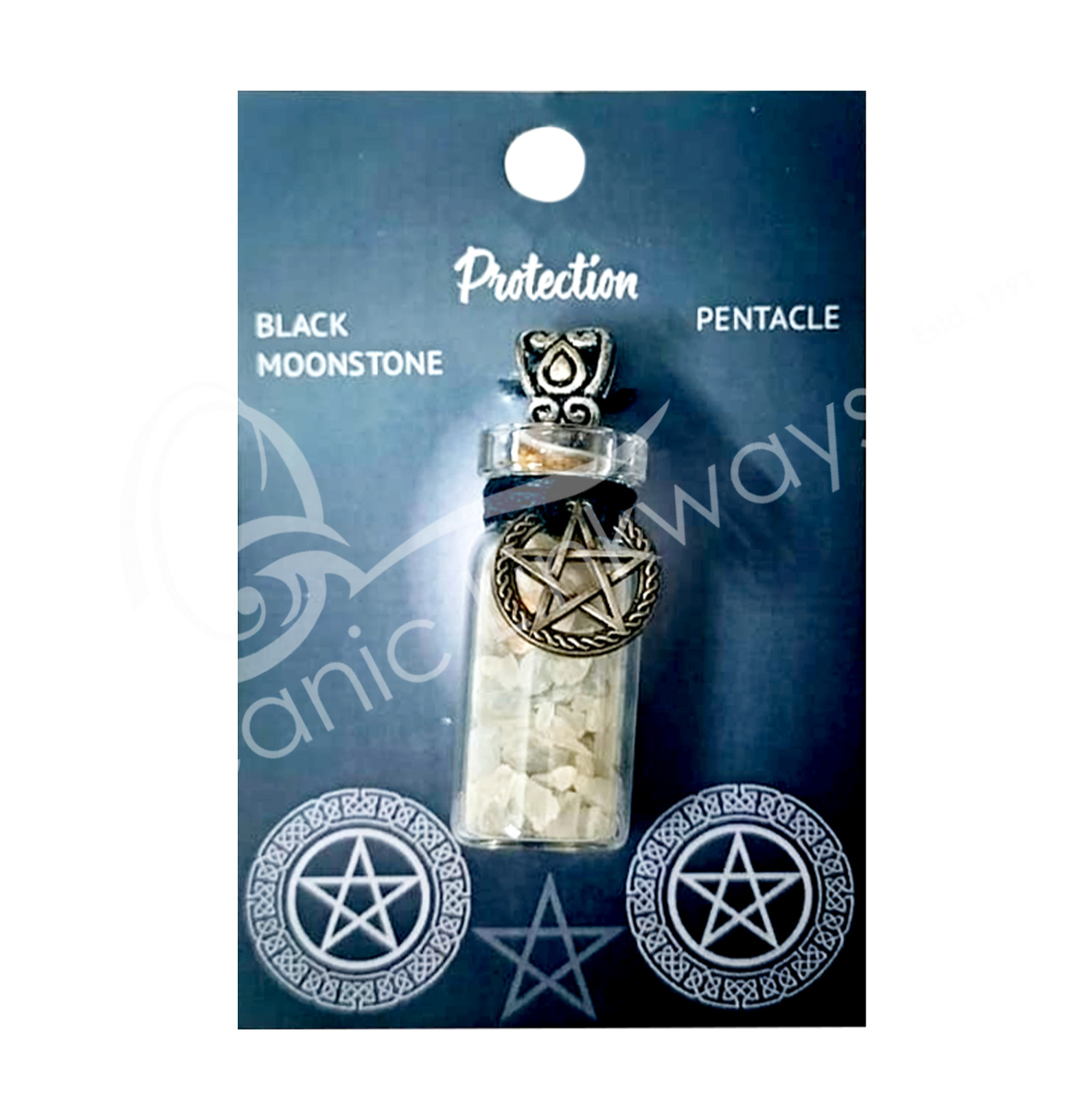 NECKLACE – CHIPS STONES IN BOTTLE MOONSTONE, BLACK WITH PENTACLE 1.5″H