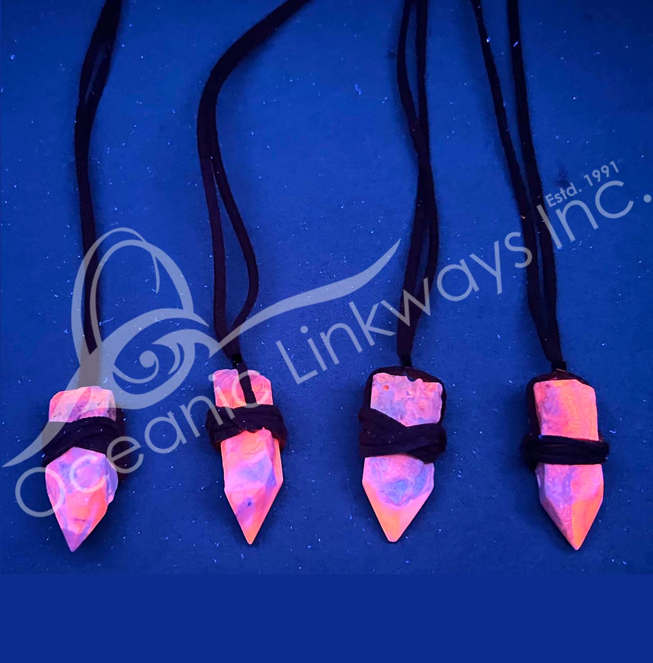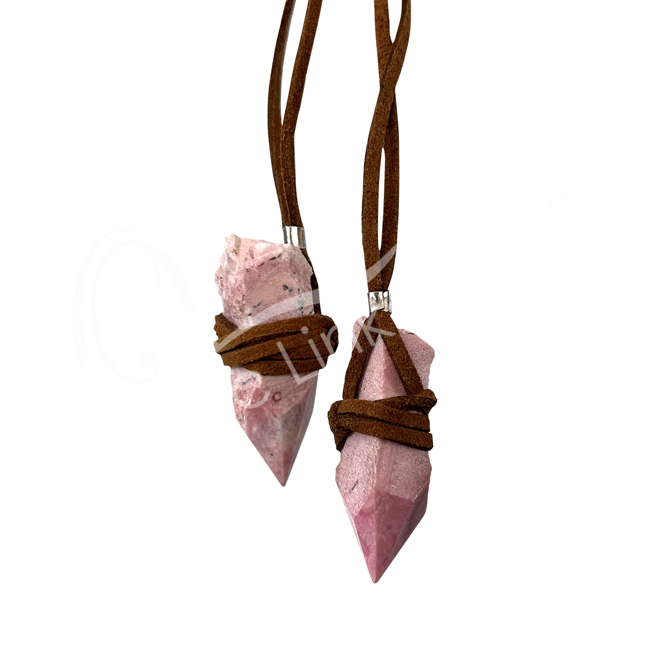 NECKLACE – POINT ROSE QUARTZ WRAPPED WITH LEATHER CORD (PK 3) 28″L