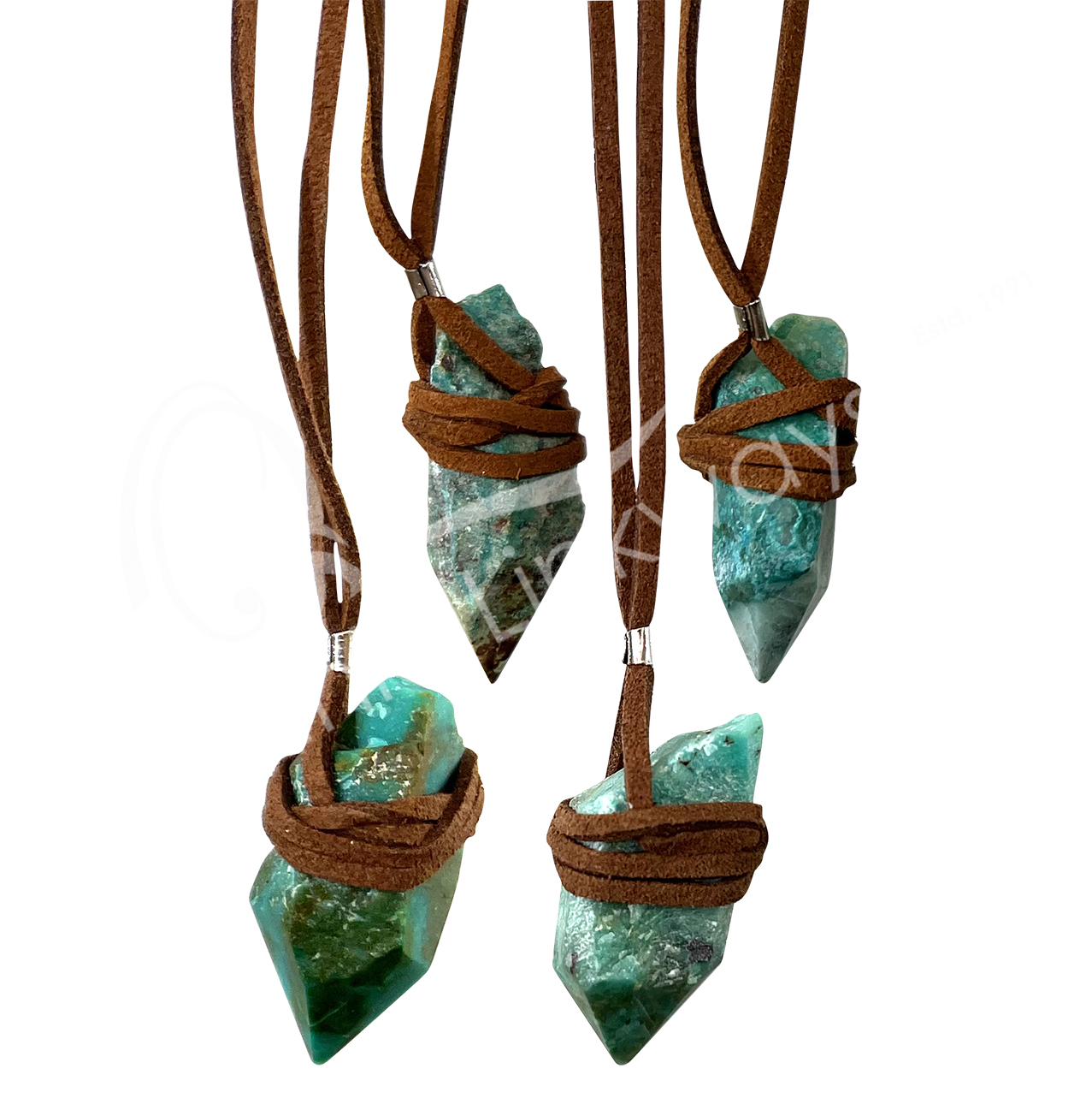 NECKLACE – POINT CHRYSOCOLLA WRAPPED WITH LEATHER CORD 16-17″L