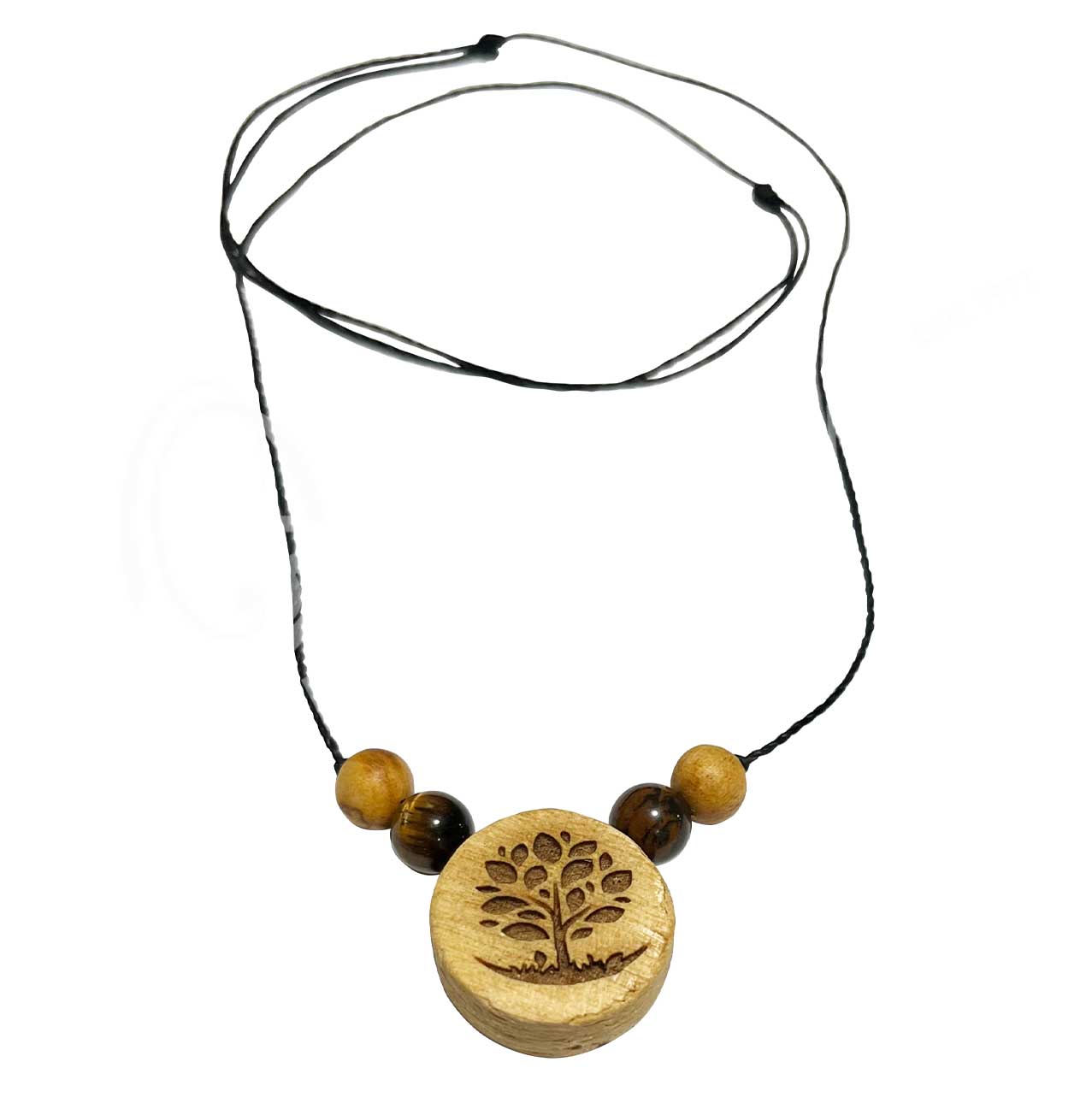 NECKLACE – PALO SANTO DISC ENGRAVED TREE OF LIFE WITH TIGER EYE (PK 3) 6-12″L