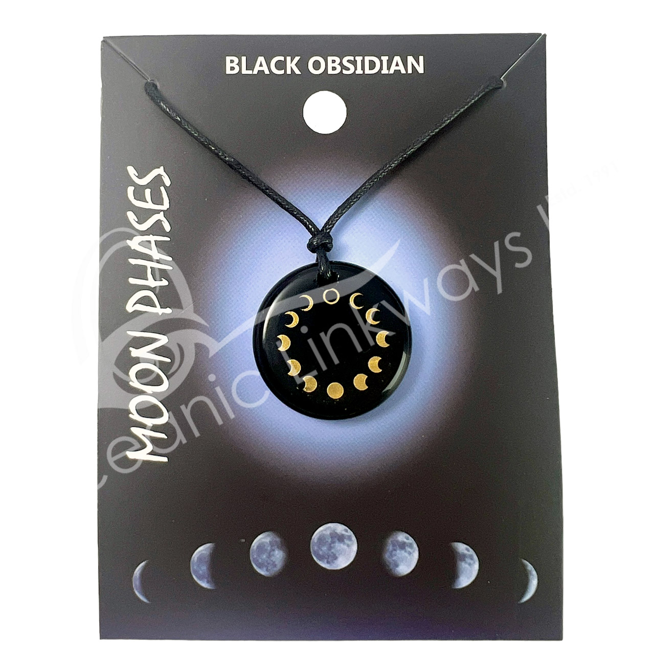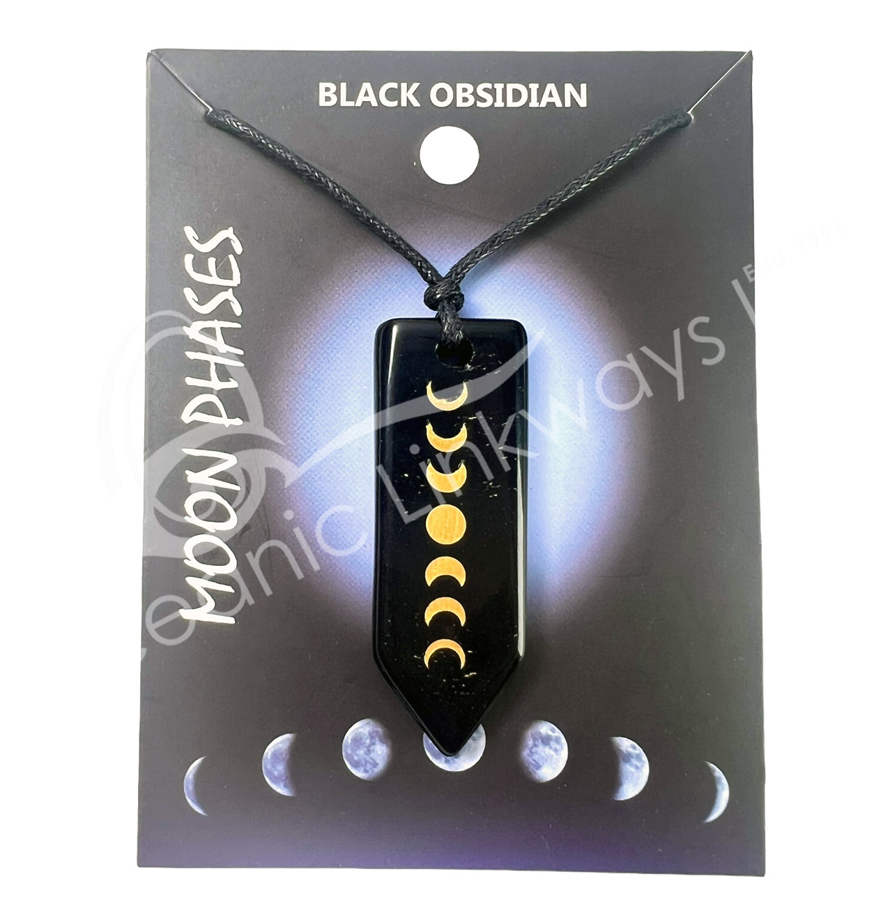 NECKLACE – MOON PHASES OBSIDIAN, BLACK FLAT POINT ENGRAVED 10-17.5″L