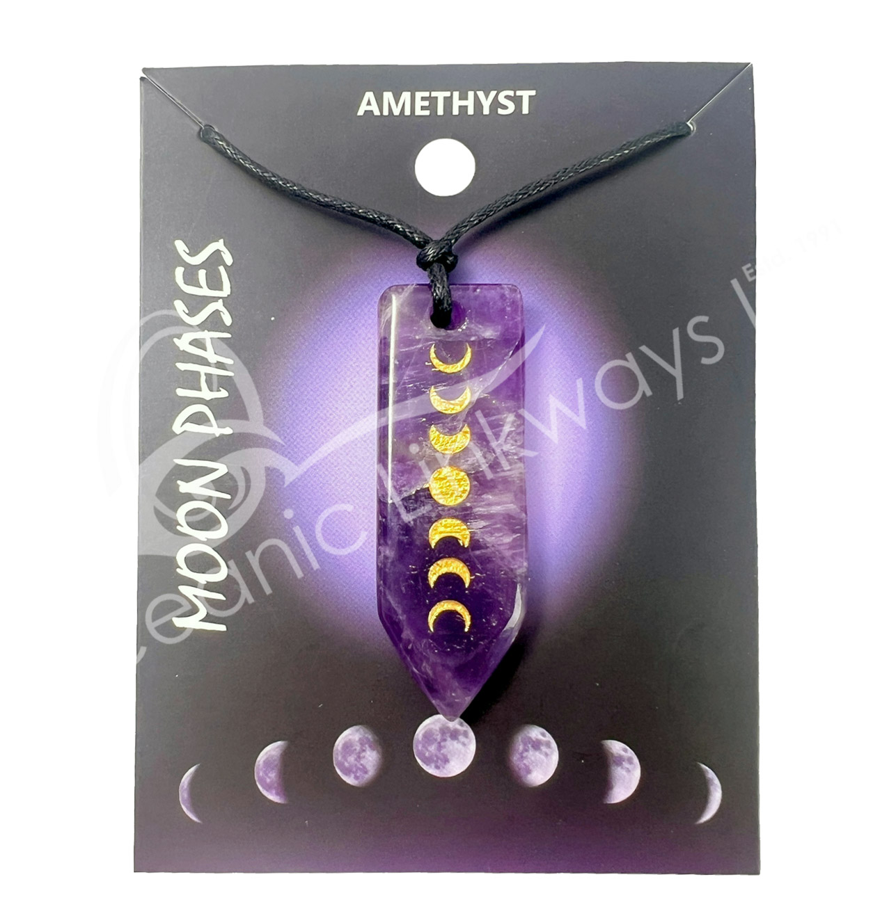 NECKLACE – MOON PHASES AMETHYST FLAT POINT ENGRAVED 10-17.5″L