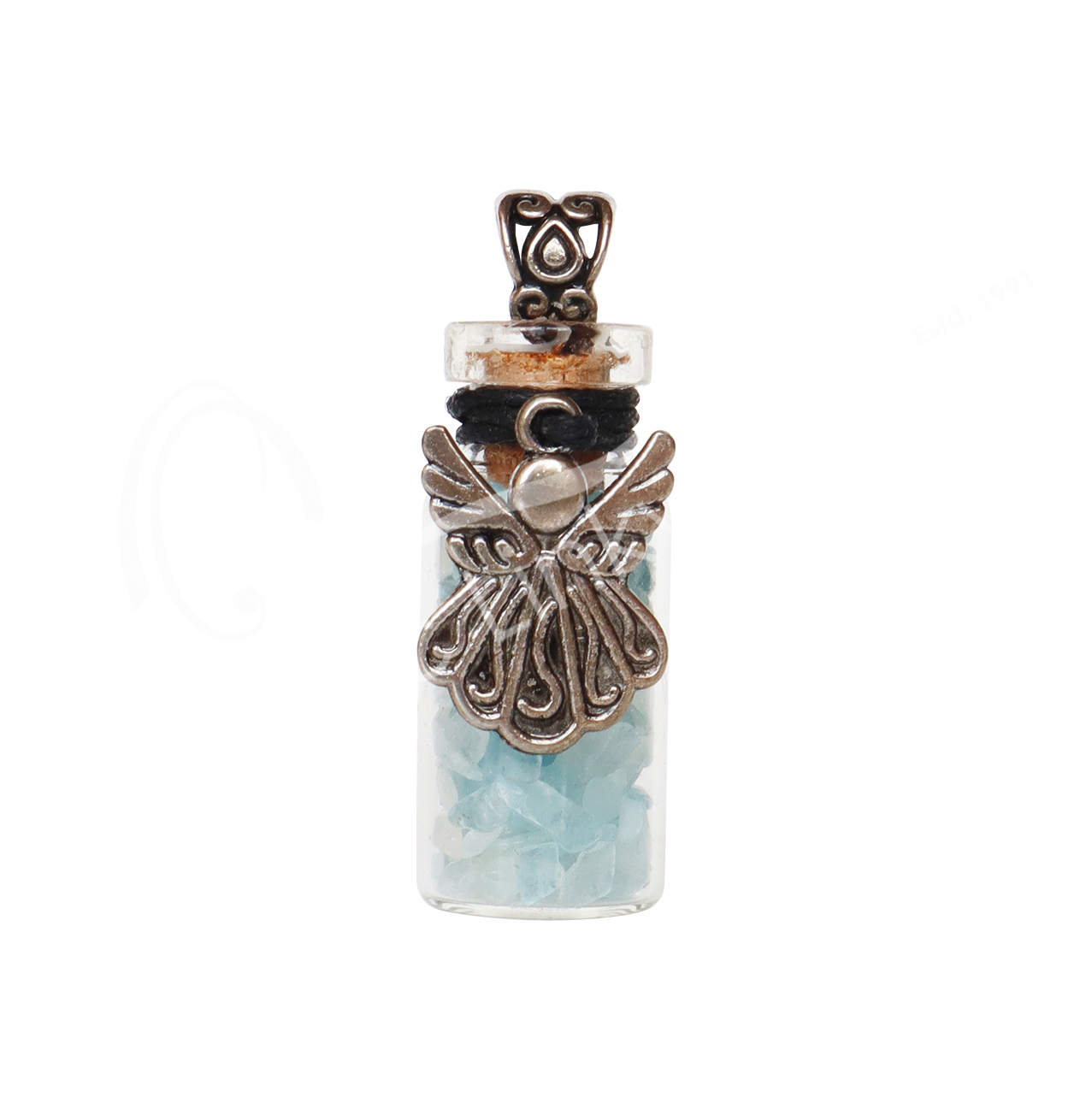 NECKLACE – CHIPS STONES IN BOTTLE AQUAMARINE WITH ANGEL 1.5″H