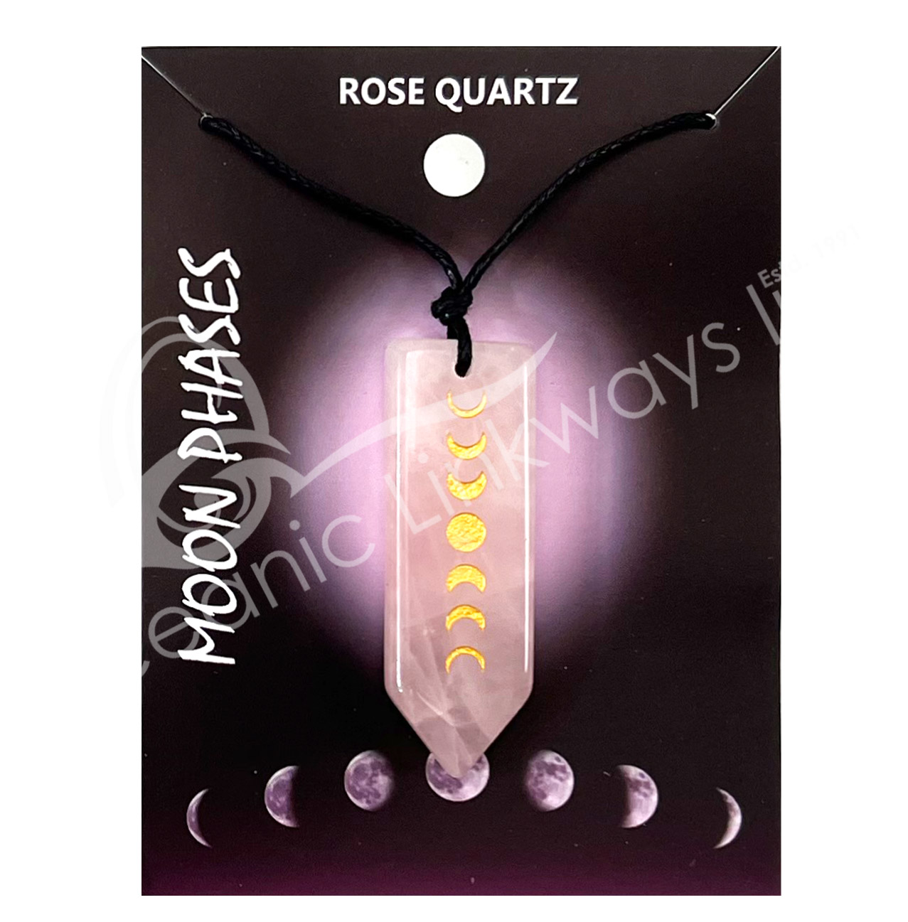 NECKLACE – MOON PHASES ROSE QUARTZ FLAT POINT ENGRAVED 10-17.5″L