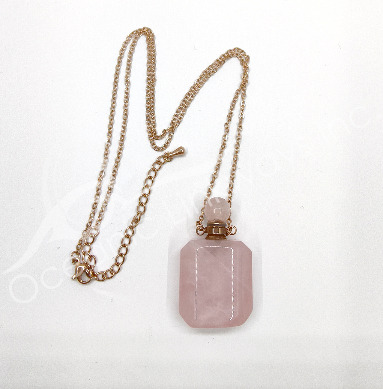 NECKLACE – CHIPS STONES IN BOTTLE ROSE QUARTZ WITH SPIRAL HAND 1.5″H